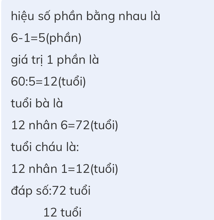Số tuổi của bà: 60:(6-1) x 6 =72 tuổi