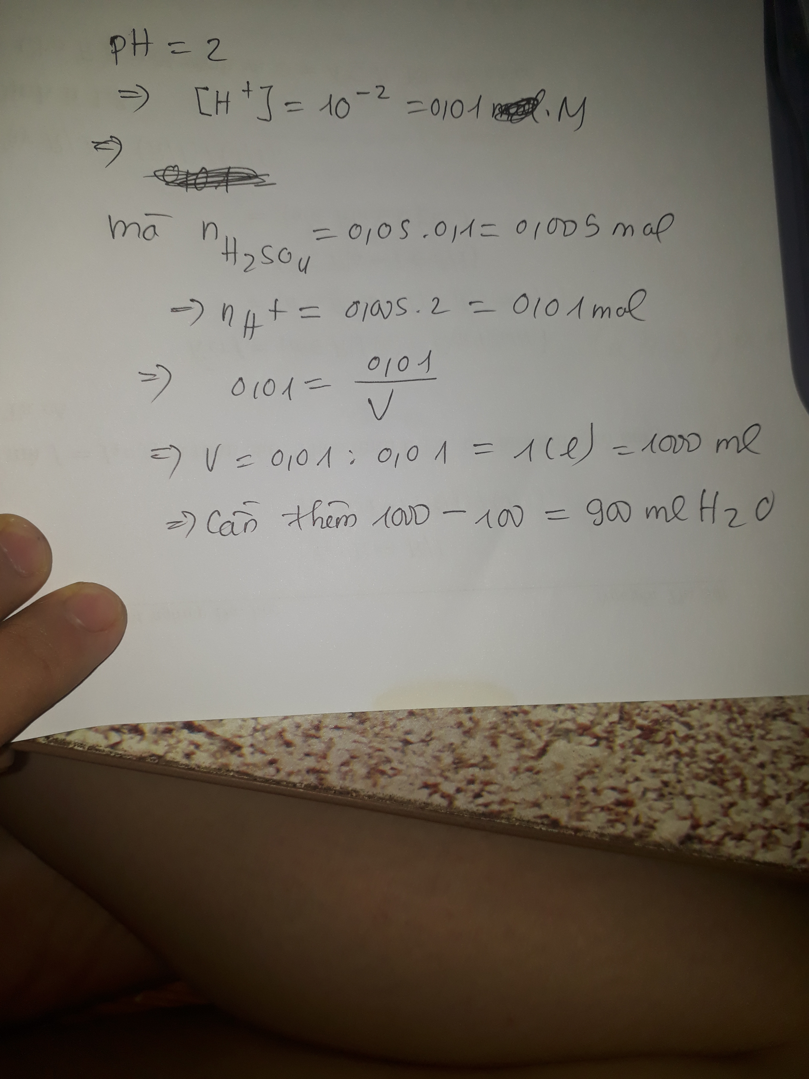 Thêm bao nhiêu ml H2O vào 100 ml dung dịch H2SO4 0,05M để được dd có pH = 2?