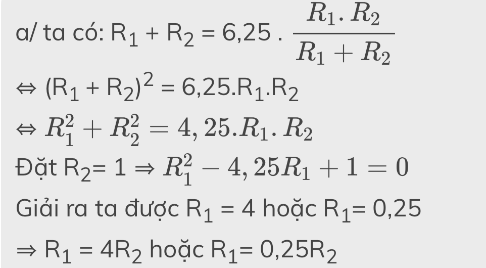 Bài 3: Hai dây dẫn, khi mắc nối tiếp có điện trở lớn gấp 6,25 lần khi mắc song song. Tính tỉ số điện trở của hai dây.