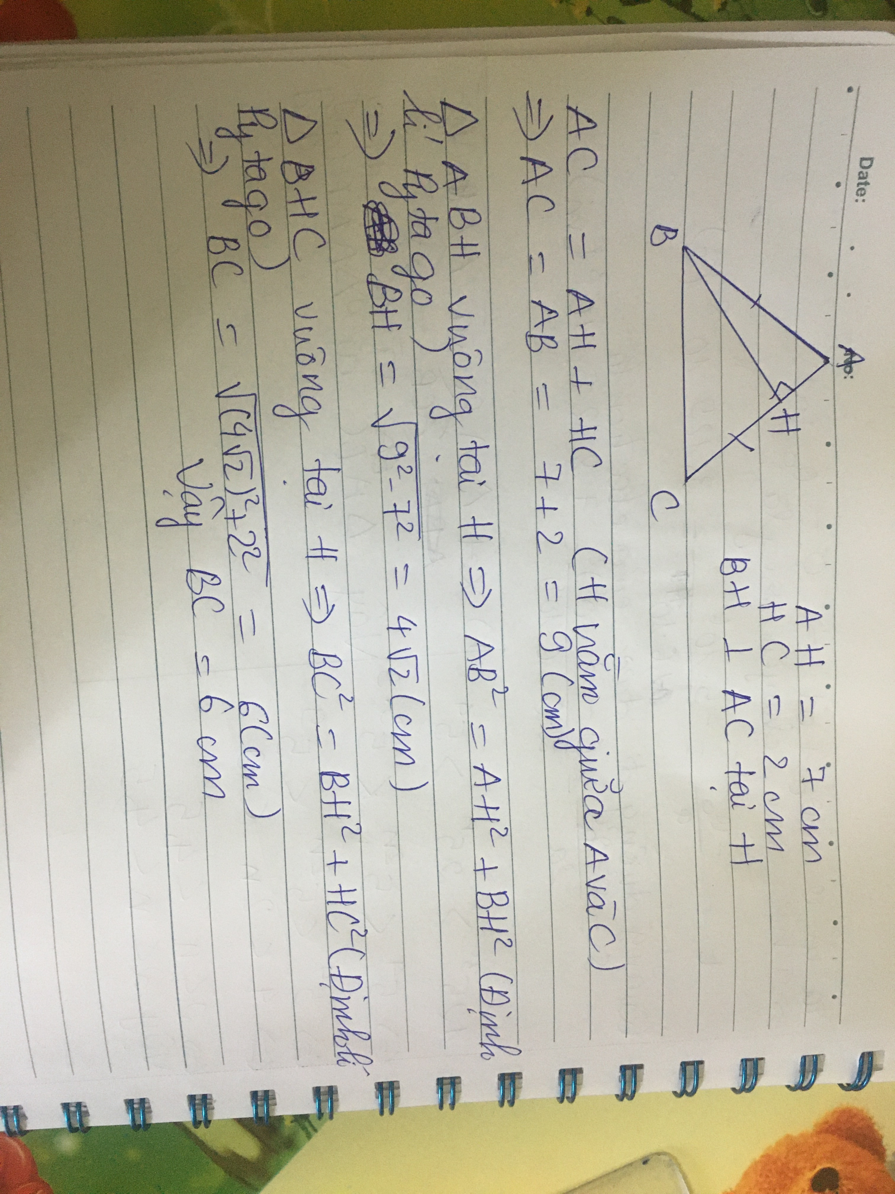Cho tam giác ABC cân tại A. Gọi H là hình chiếu của B trên AC. Tính cạnh đáy BC của tam giác biết AH=7cm HC=2cm
