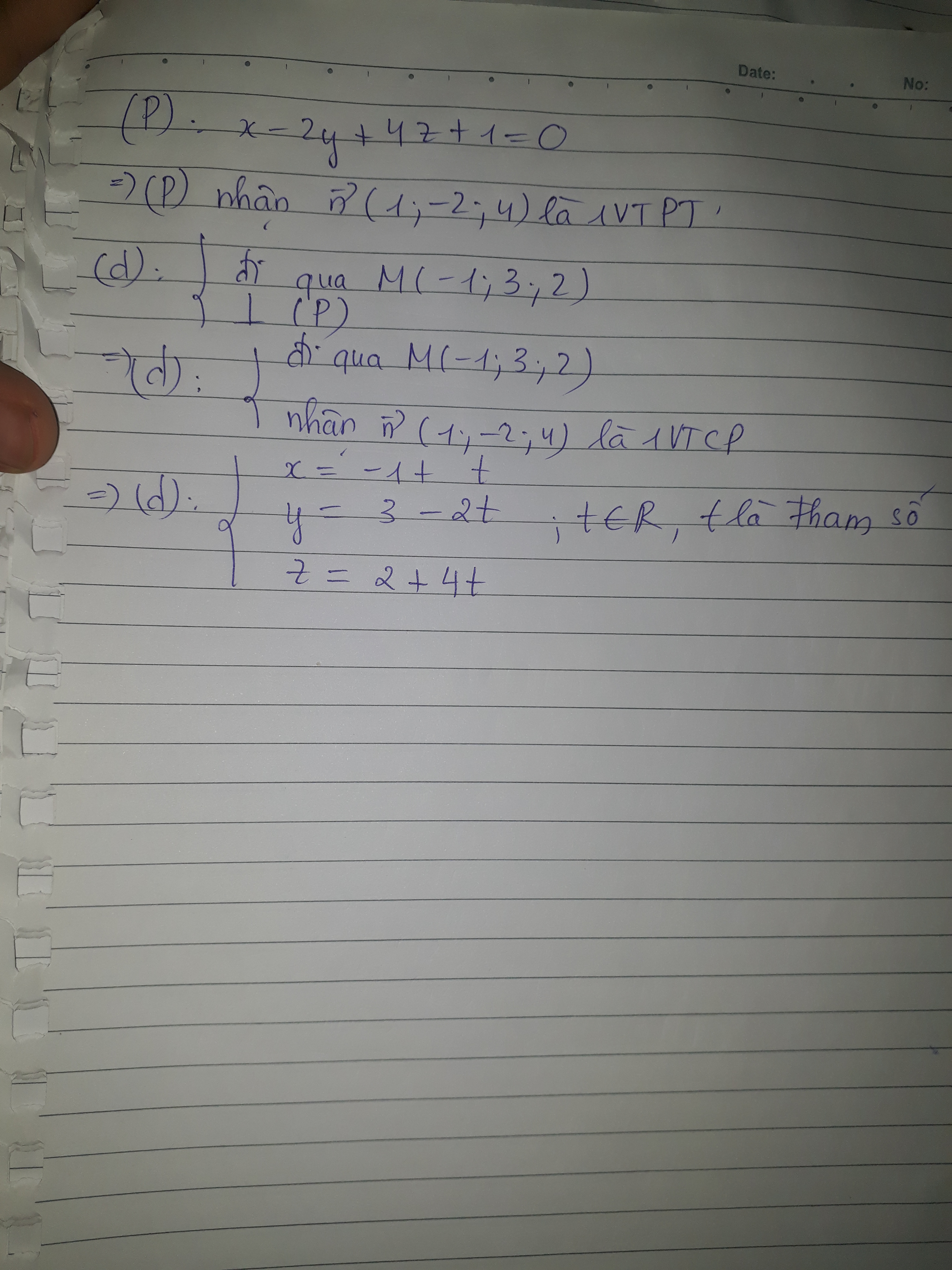 1206)Trong không gian Oxyz cho điểm M(-1;3;2) và mp (p):x-2y+4z+1=0. Đường thẳng đi qua M và vuông góc với (p) có phương trình là?