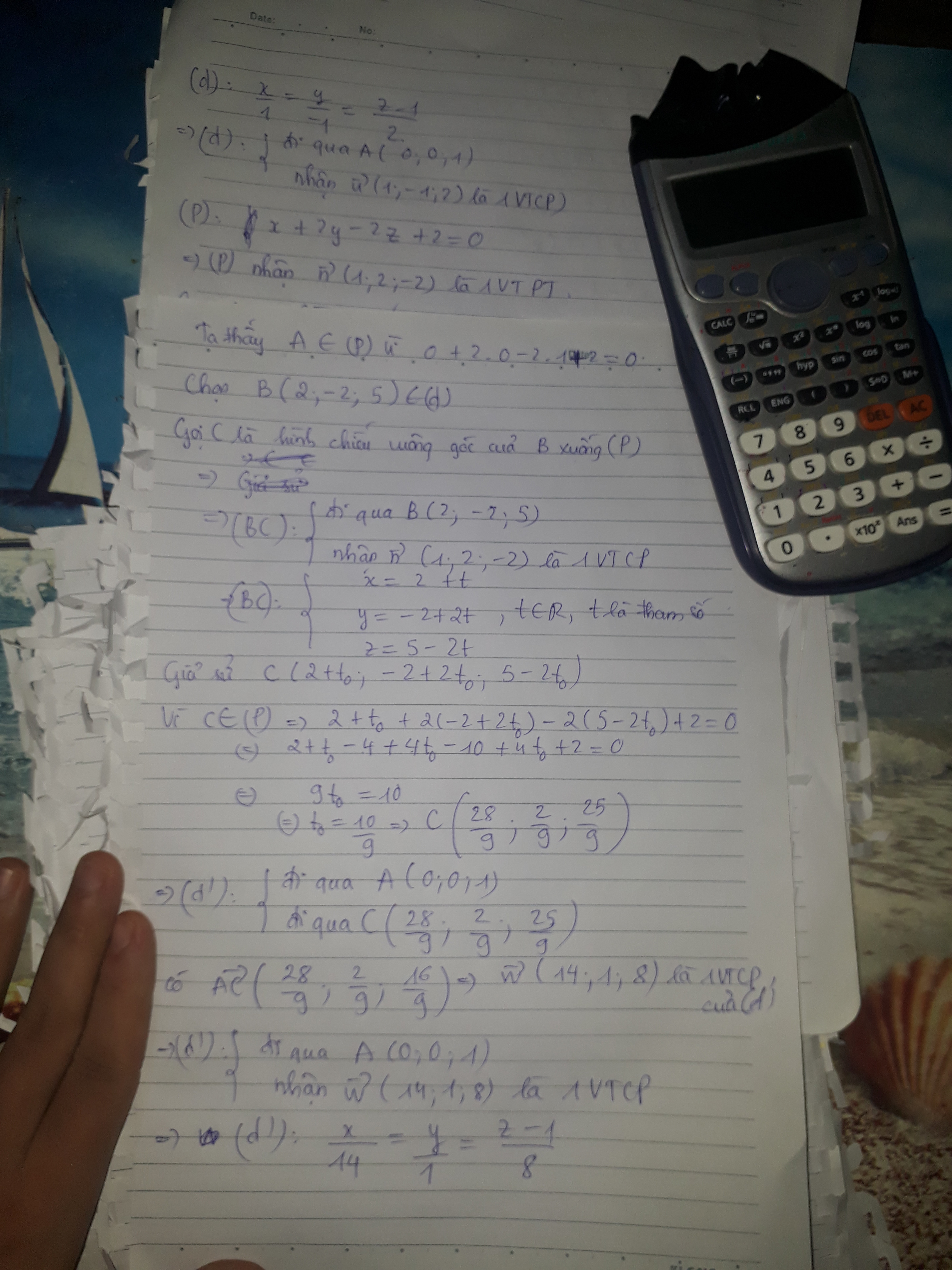 Trong không gian oxyz cho đthang d: x/1=y/-1=z-1/2 và mp (p):x+2y-2x+2=0.Hình chiếu vuông góc của d trên (p) là đường thẳng có ptrinh chính tắc là?