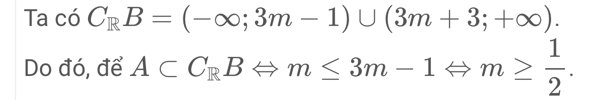 1, Cho 2 tập hợp A=(- vô cực ; m) và B=[3m - 1; 3m+3]. Tìm tất cả các giá trị thực của tham số m để A ⊂ R \ B
