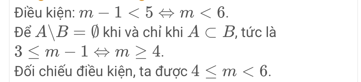 2, Cho 2 tập hợp A=(m-1; 5) và B=(3; + vô cực). Tìm m để A \ B = ∅