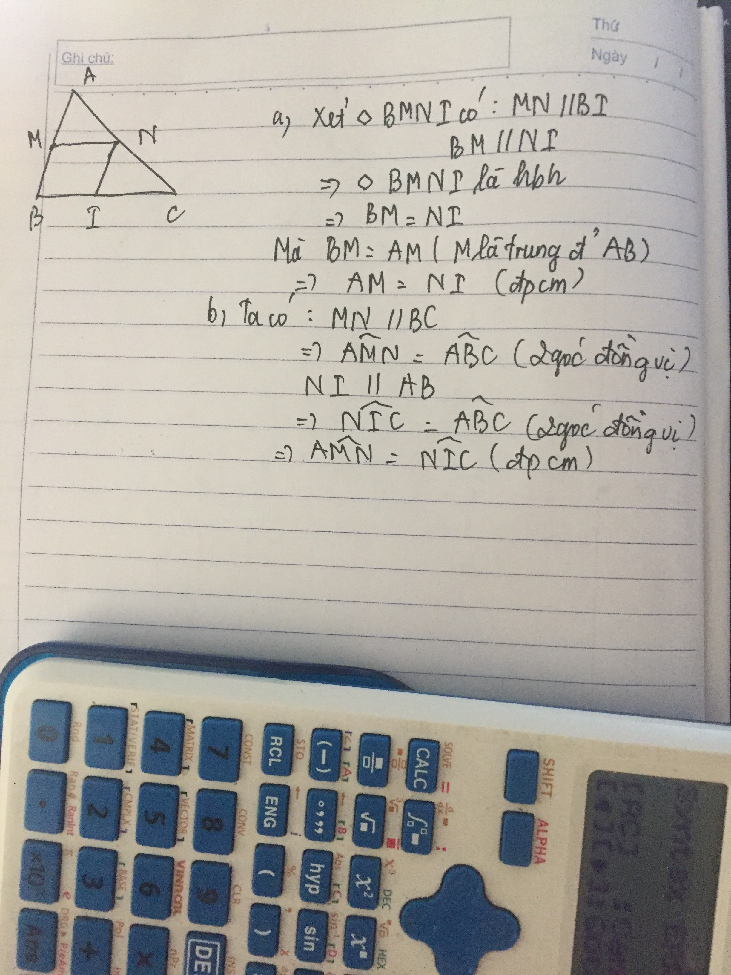 Cho tam giác ABC có M là trung điểm AB. Từ M kẻ MN//BC( N thuộc AC). Từ N kẻ NI//AB( I thuộc BC)