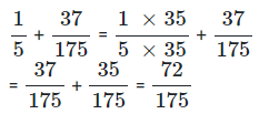`1/5` + `37/175` = `(1 × 35)/(5 × 35)` + `37/175`