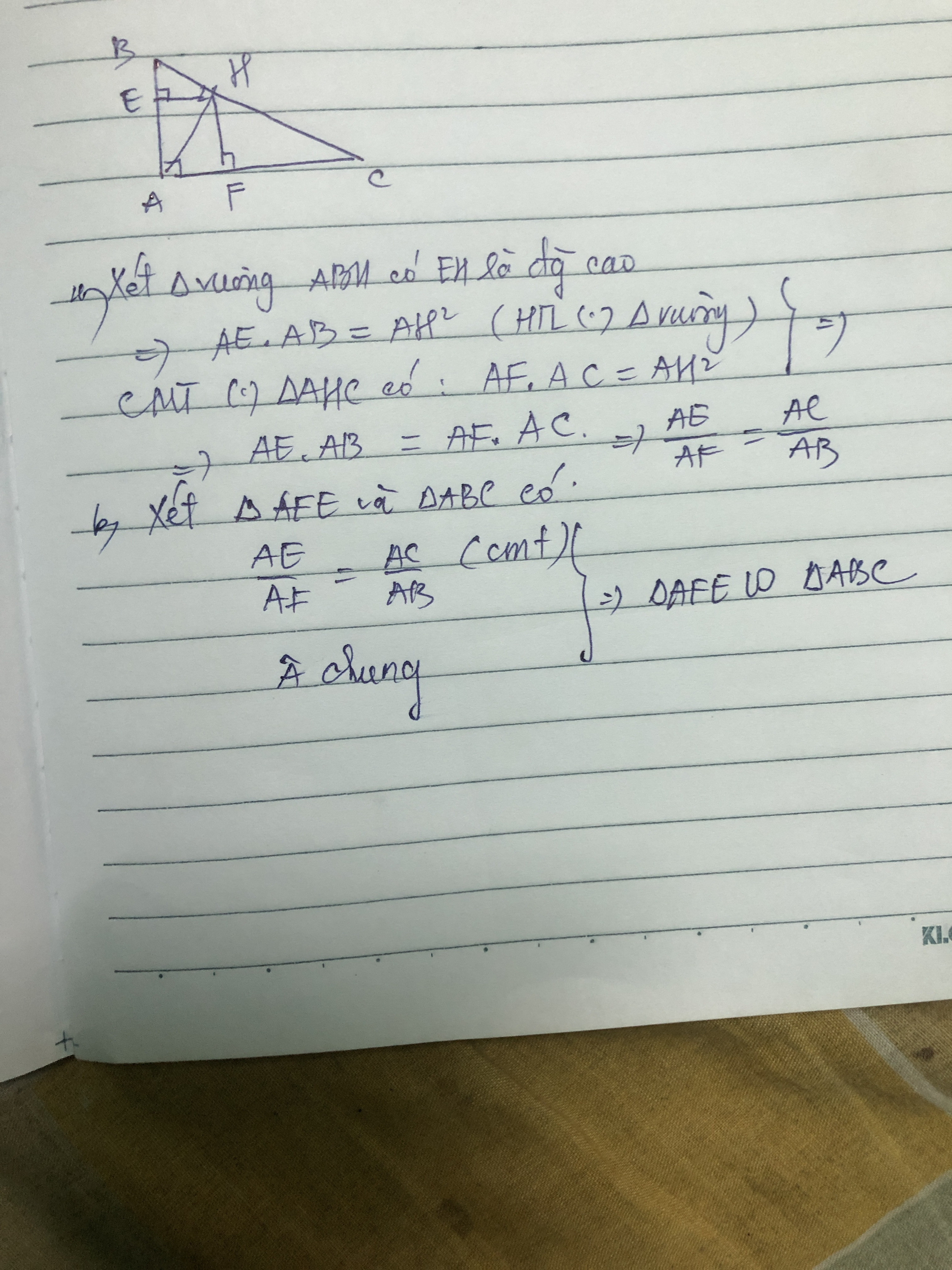 Kẻ HE vuông góc với AB tại E, kẻ HF vuông góc với AC tại F. Chứng minh rằng AE.AB= AF.AC, từ đó chứng minh tam giác AFE và tam giác ABC đồng dạng