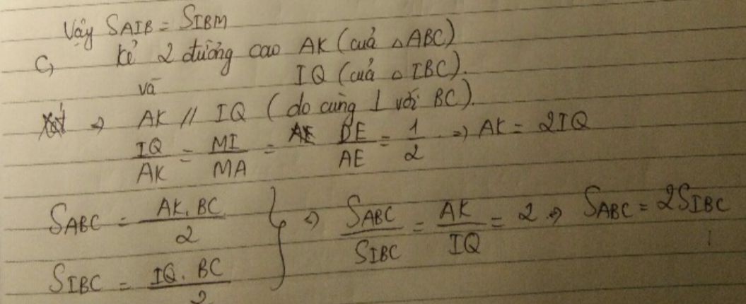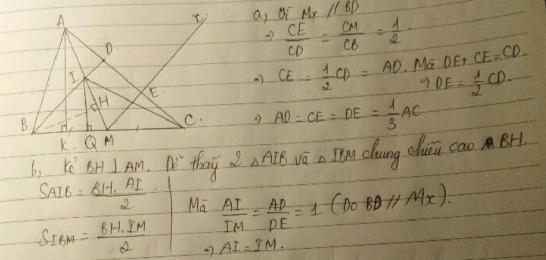 Cho tam giác ABC. Đường trung tuyến AM, lấy điểm D trên cạnh AC sao cho AD=1/2 DC. Kẻ Mx//BD cắt AC tại E. Đoạn BD cắt AM tại I. CM: