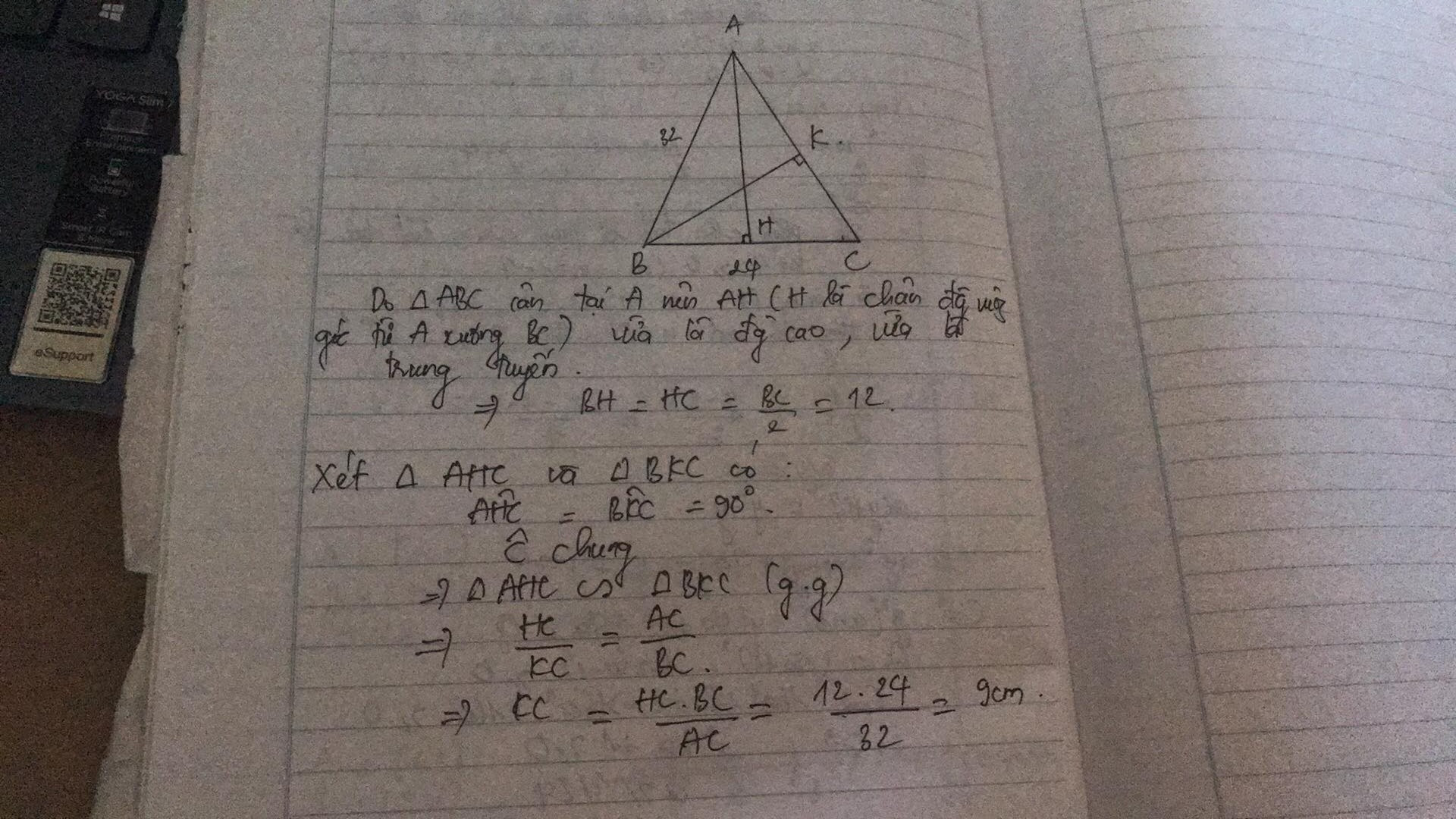 Cho cân tại A , AB =32cm, BC=24cm . Kể đường cao BK . Tính KC