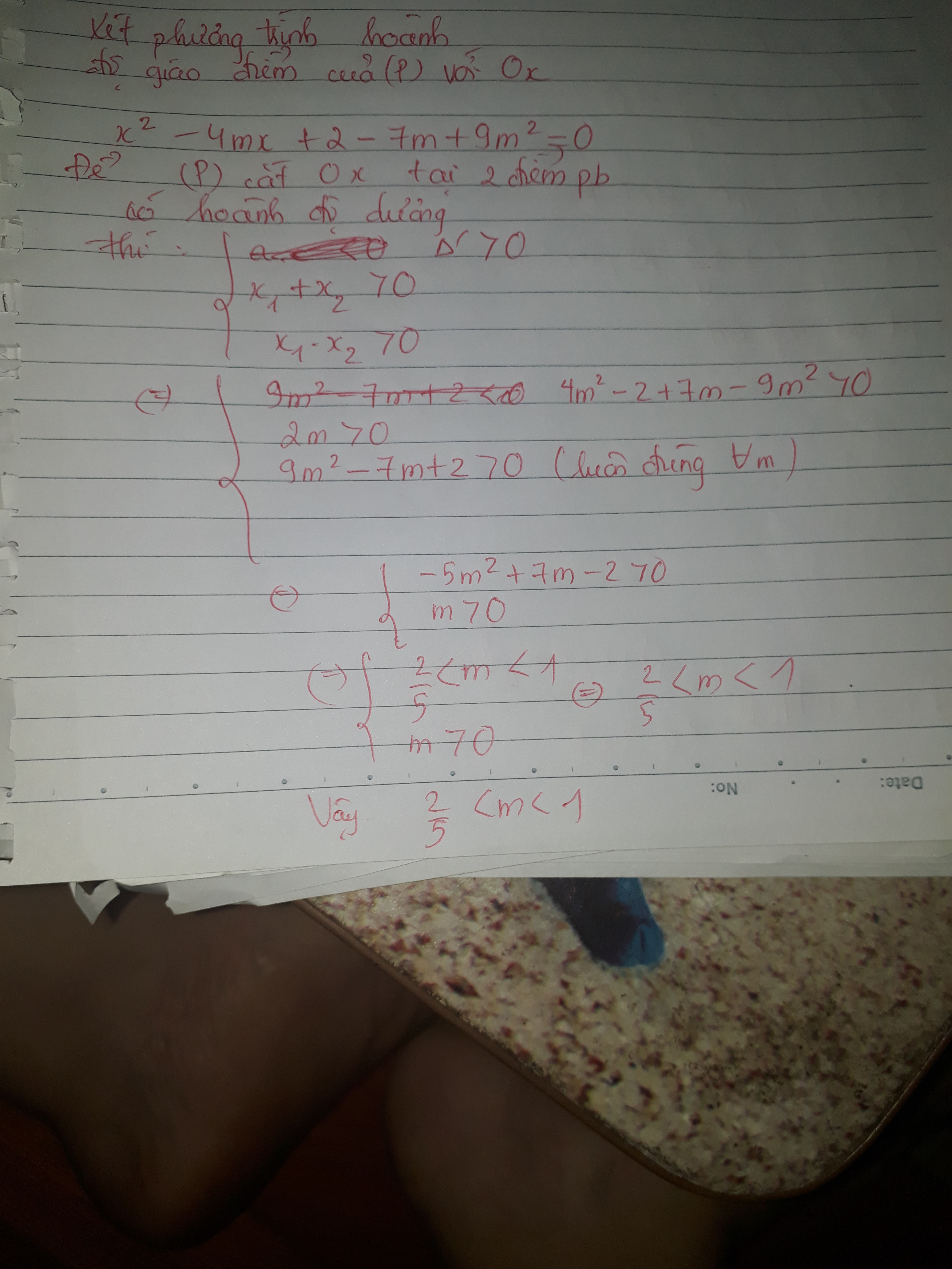 Theo Viet: {x1+x2=4mx1.x2=9m2−7m+2(P) cắt Ox tại 2 điểm có x>0<=>{x1>0x2>0<=>{x1+x2>0x1.x2>0