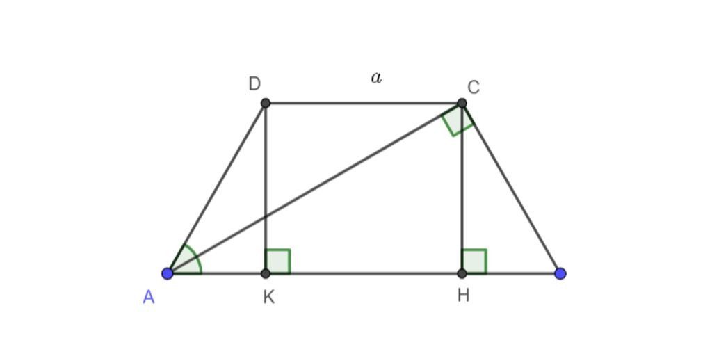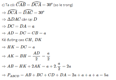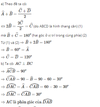 Cho hình thang cân ABCD có đáy nhỏ CD=a,tổng hai góc A và B bằng nửa tổng hai góc C và D.Hai đường chéo AC và BD vuông góc với nhau.a,tính các góc của hình thang ABCD.b,cm AC là tia phân giác của góc BAD.c,tính chu vi hình thang ABCD