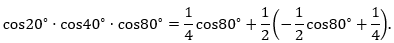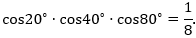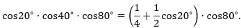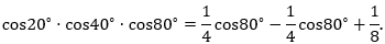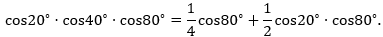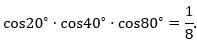 A=cos20.cos40.cos80=>A.sin20=sin20.cos20.cos40.cos80=12sin40.cos40.cos80=12.12sin80.cos80=12.14.sin160=18.sin160=18.sin20 (do 20+160=180 nên sin20=sin160)=>A=18
