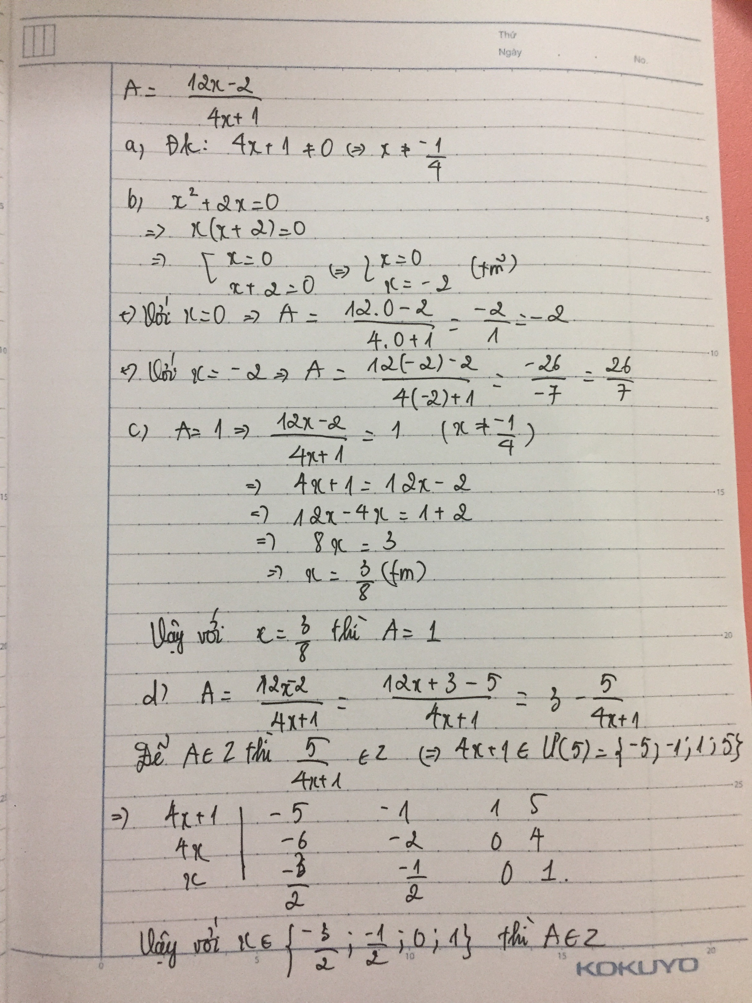 a,tìm giá trị thích hợp của biến x trong A b,tính giá trị của A khi x mũ2+2x=0 c, tìm giá trị của x để A =1 d,tìm x để A có giá trị nguyên e, tìm x để A<0
