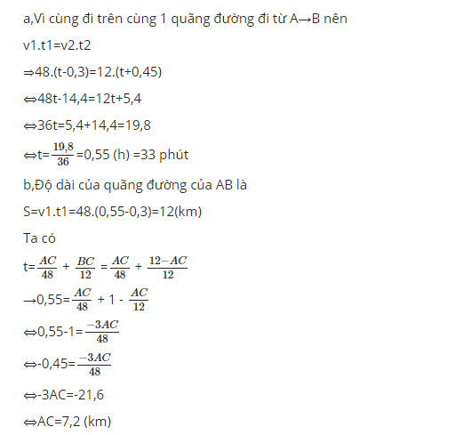 Một chiếc xe đi từ địa điểm A đến địa điểm B trong khoảng thời gian dự định là t. Nếu xe chuyển động với vận tốc v1 = 48 km/h thì xe tới B sớm hơn dự định 18 phút; nếu xe chuyển động với vận tốc v2 = 12 km/h thì xe đến B muộn hơn dự định 27 phút. 1. Tính chiều dài quãng đường AB và thời gian dự định t. 2. Để đến B đúng thời gian dự định t, thì xe chuyển động từ A đến C (C nằm với vận tốc v1 = 48 km/h, rồi tiếp tục từ C đến B với vận tốc v2 = 12 km/h. Tìm chiều quãng đường CB.