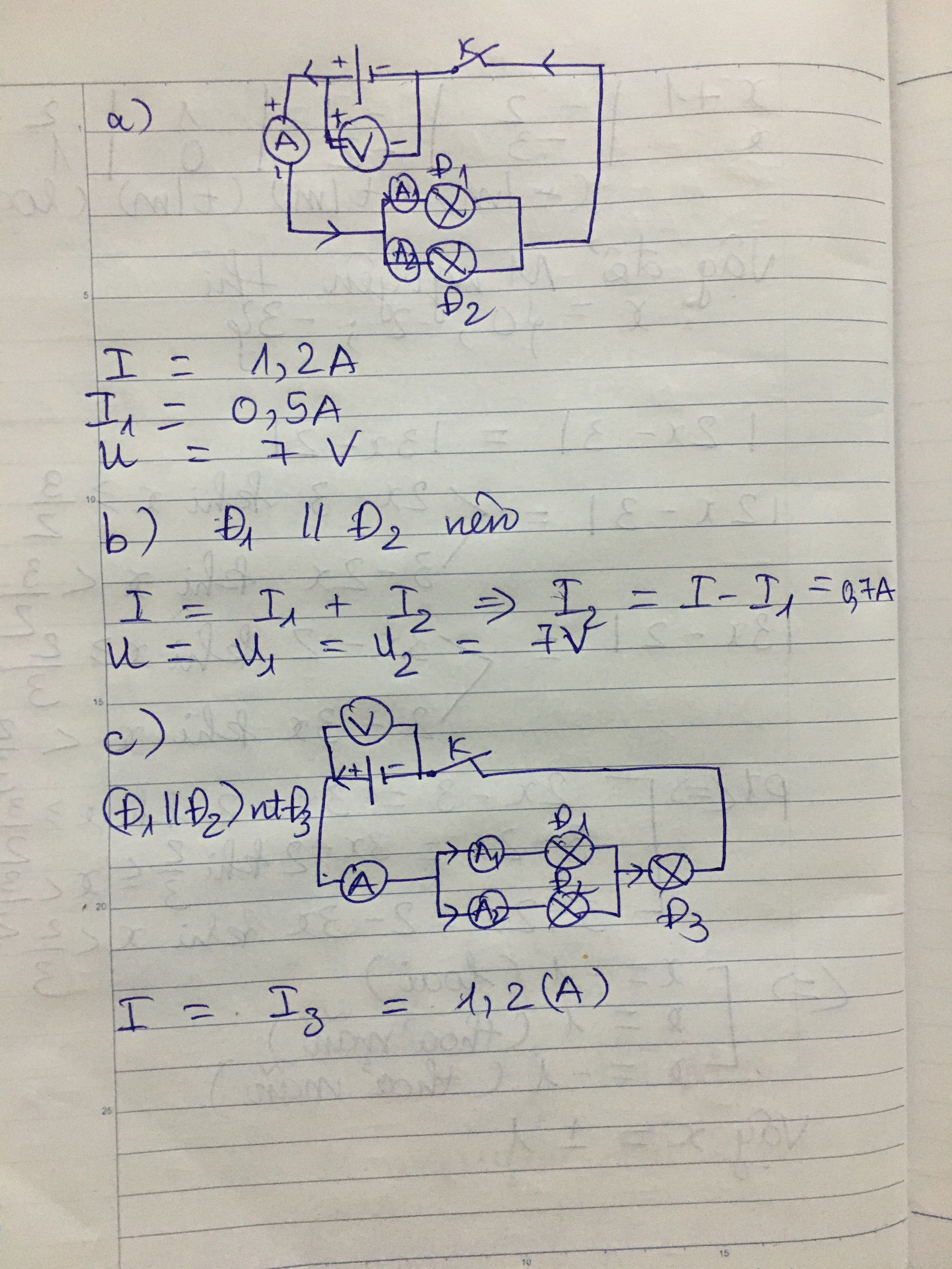 Cho mạch điện gồm 2 đèn Đ1,Đ2 mắc song song như hình vẽ. Ampe kế A đo cường độ dòng điện trong mạch có số chỉ 1,2A; ampe kế A1 đo cường độ dòng điện qua đèn 1 có số chỉ 0,5A; vôn kế V đo hiệu điện thế 2 đầu đoạn mạch có số chỉ 7V.