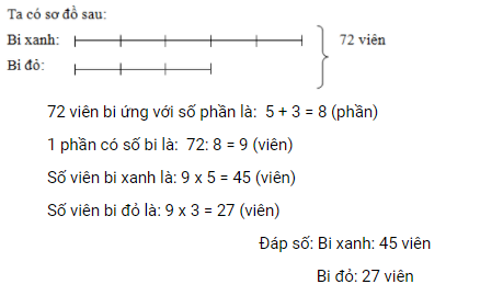 Bạn Hòa có 72 viên bi màu xanh và màu đỏ. Bạn Hòa nhận thấy 1/5 số viên bi xanh bằng 1/3 số viên bi màu đỏ. Hỏi bạn Hòa có bao nhiêu viên bi màu đỏ? Bao nhiêu viên bi màu xanh?