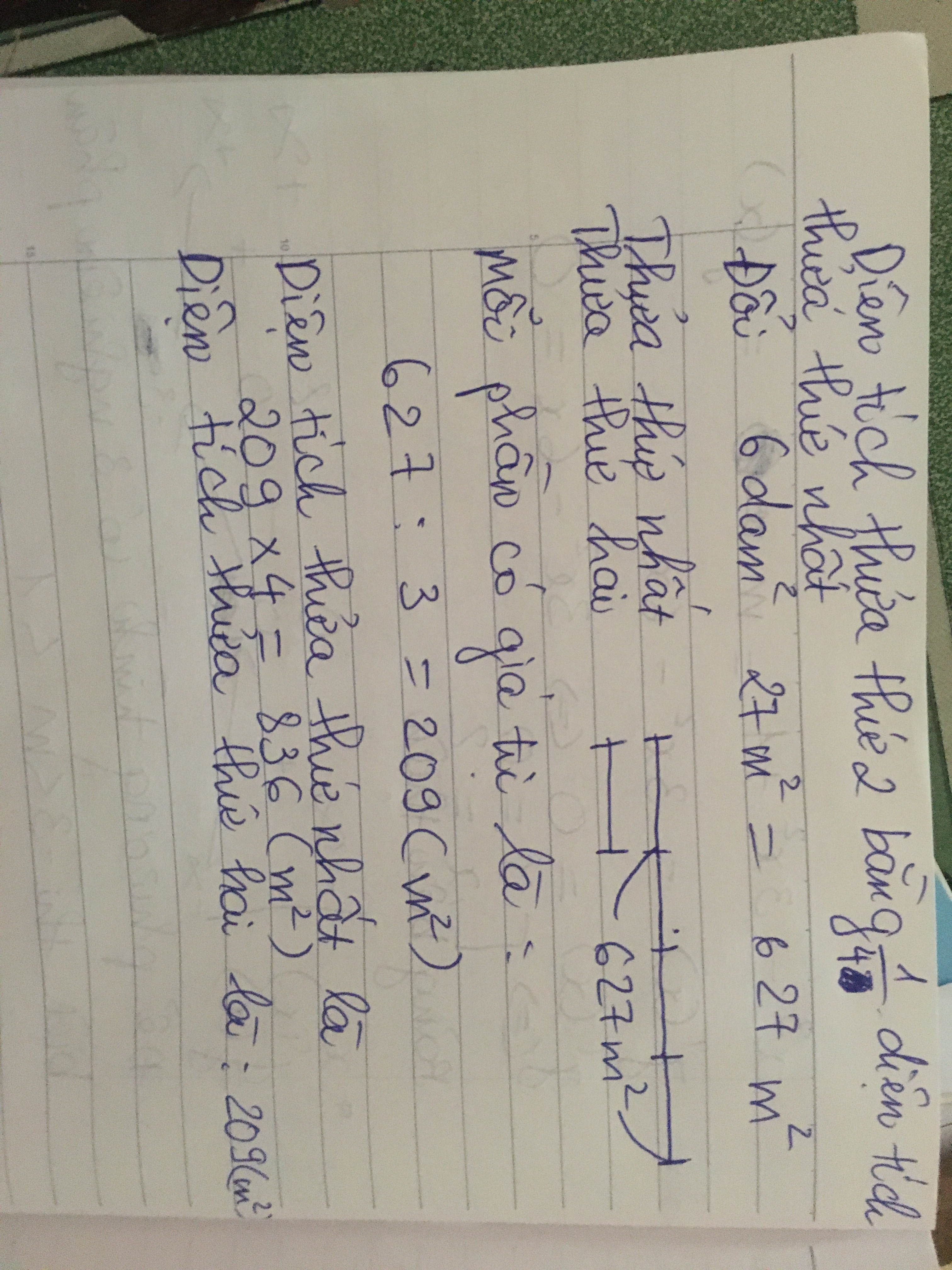 Bài 3: Diện tích thửa ruộng thứ nhất nhiều hơn thửa ruộng thứ hai là 6 dam2 27 m2. Biết diện tích thửa thứ hai bằng diện tích thửa thứ nhất. Tính diện tích mỗi thửa ruộng?