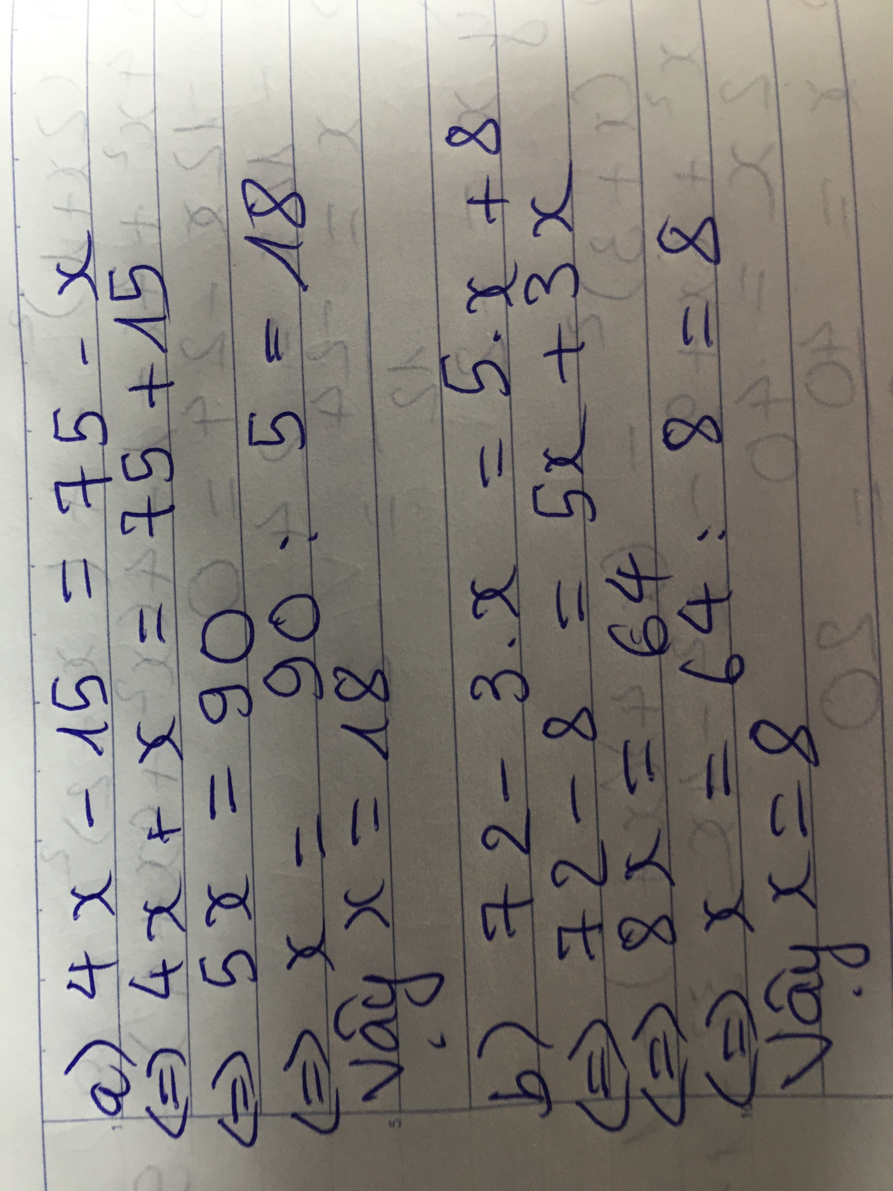 a) 4.x-15=75-x