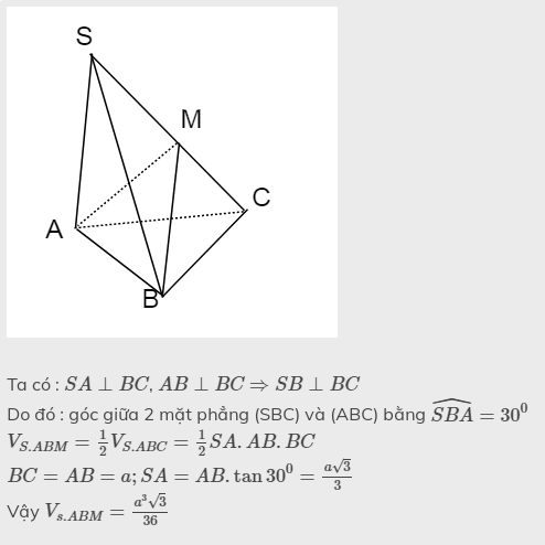 Cho hình chóp S. ABC có đáy ABC là tam giác vuông cân tại B, AB=a, SA vuông với mặt phẳng (ABC), góc giữa 2 mặt phẳng (SBC) và (ABC) =30 độ. Gọi M là trung điểm của cạnh SC. Tính thể tích của khối chóp S. ABC