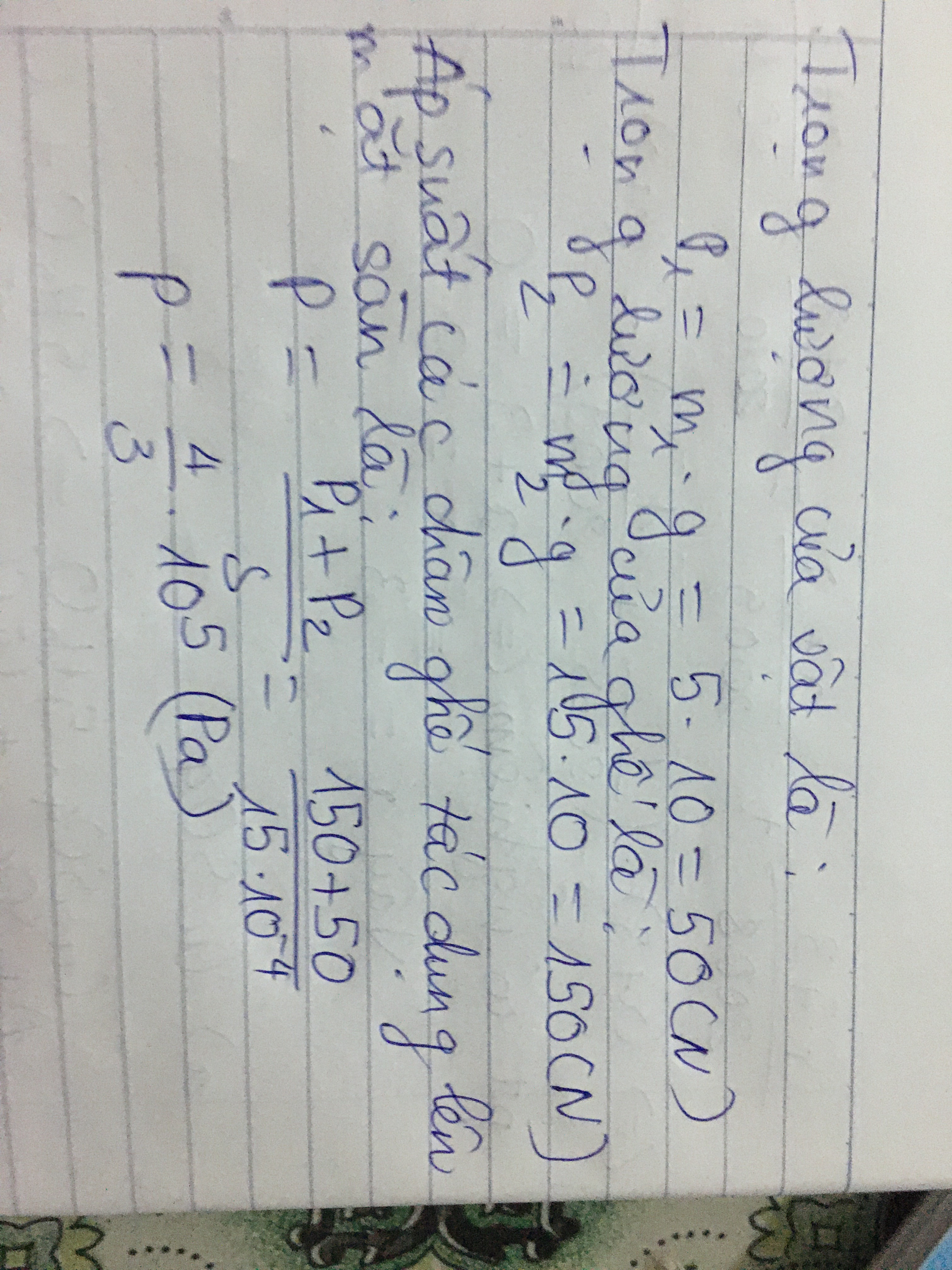 một ghế có 4 chân như nhau.Khối lượng 15kg.Diện tích tiếp xúc mỗi chiếc ghế với nền nhà nằm ngang là 15cm^2.Khối lượng phân bố đều ở bốn ghế chân.Đặt vào chính giữa ghế một vật khối lượng là 5kg.Tính áp suất của 4 chân ghế?![]()