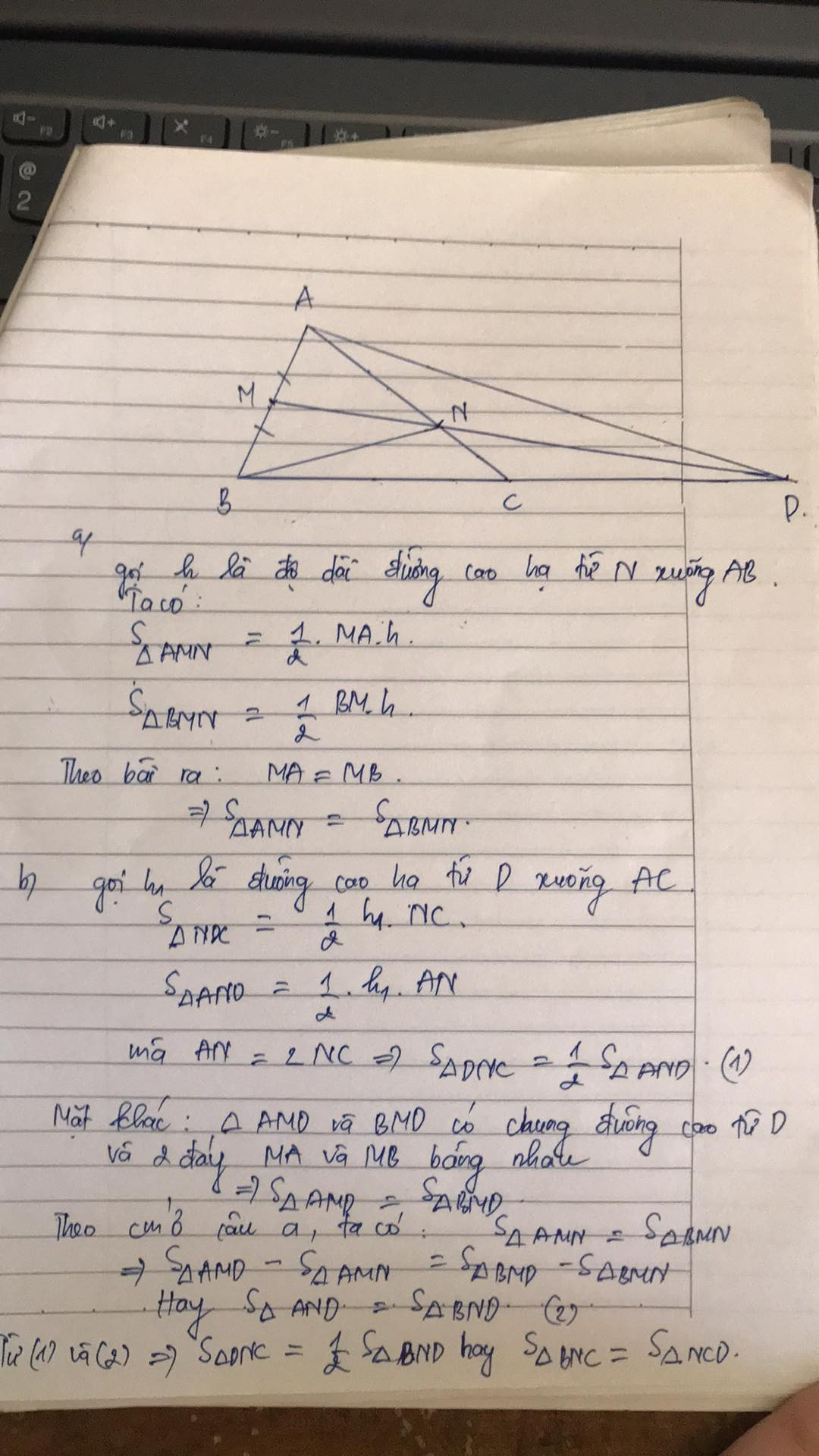 A) so sánh diện tích hai tam giác AMN và BMN.