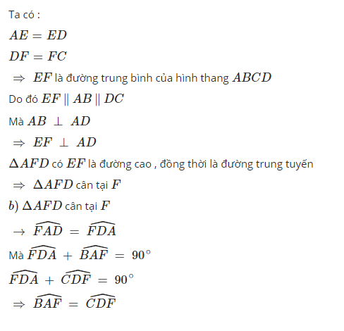 Cho hình thang ABCD vuông tại A và D . Gọi E , F lần lượt là trung điểm của AD , BC . CMR :