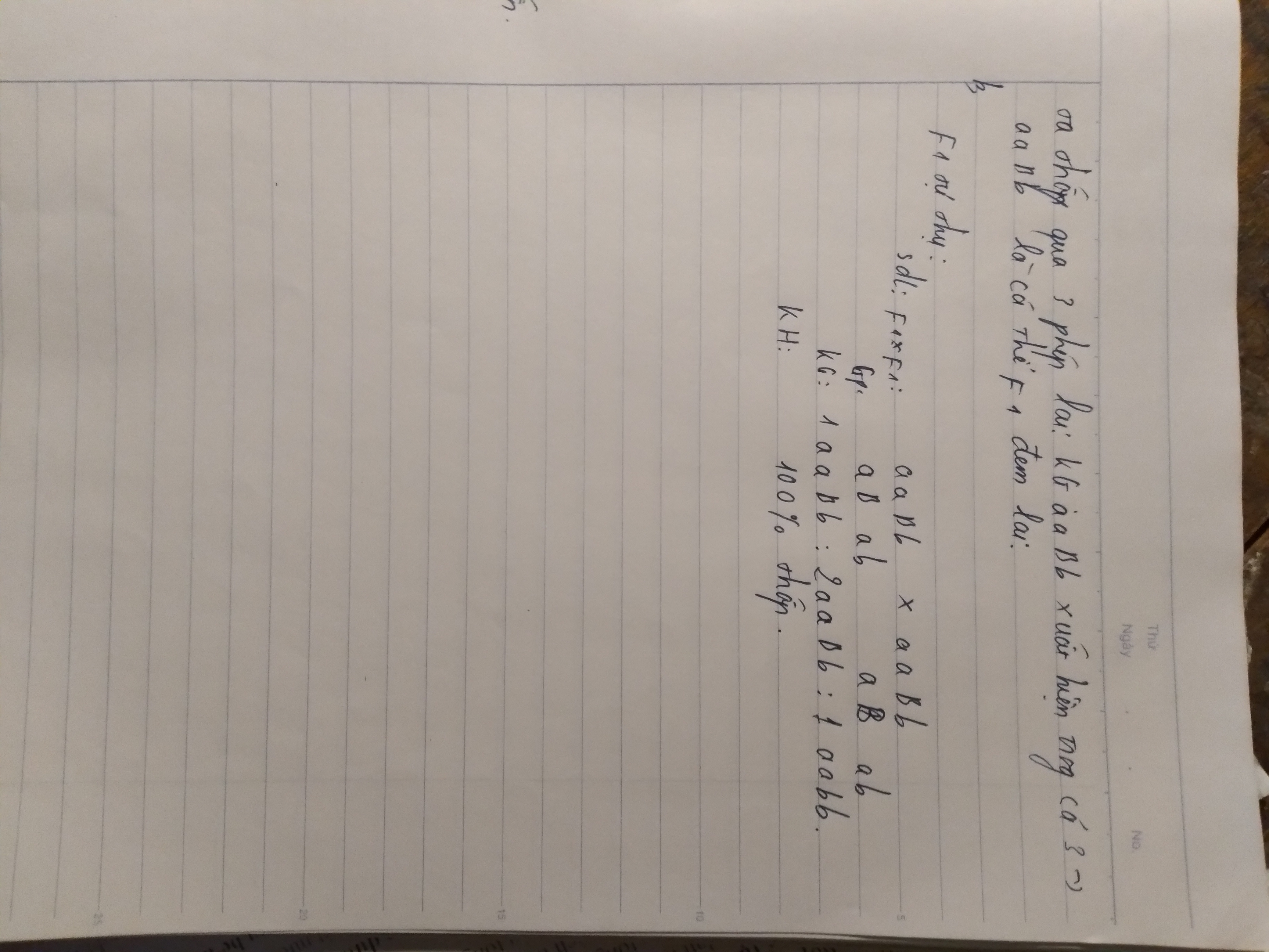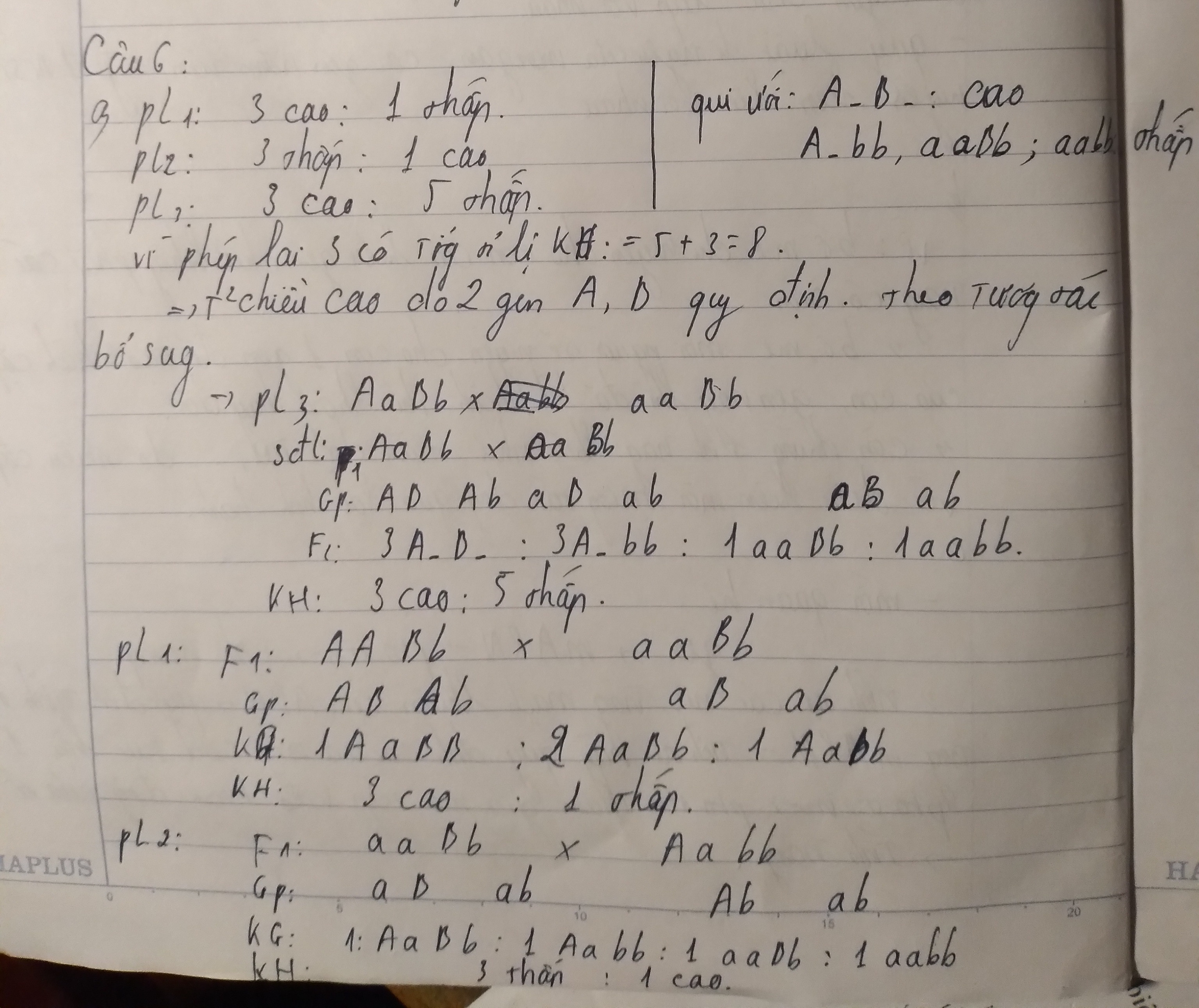 Mik lm thế này bn xem thử . Sửa lại f2 của pl3 nhé. Là 3A_B_: 1 Aabb: 3aaB_:1aabb