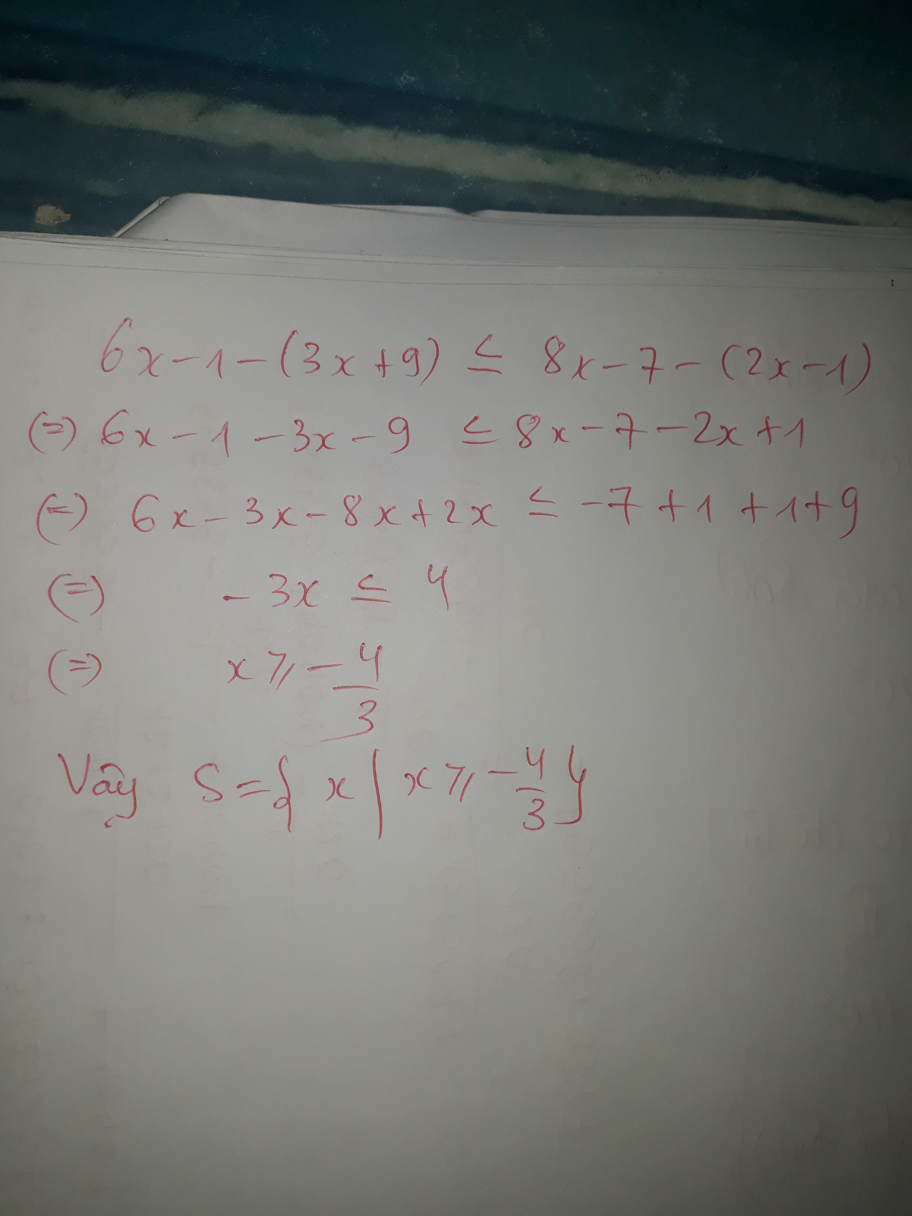 Giải bất pt: 6x-1-(3x+9) <= 8x-7-(2x-1)