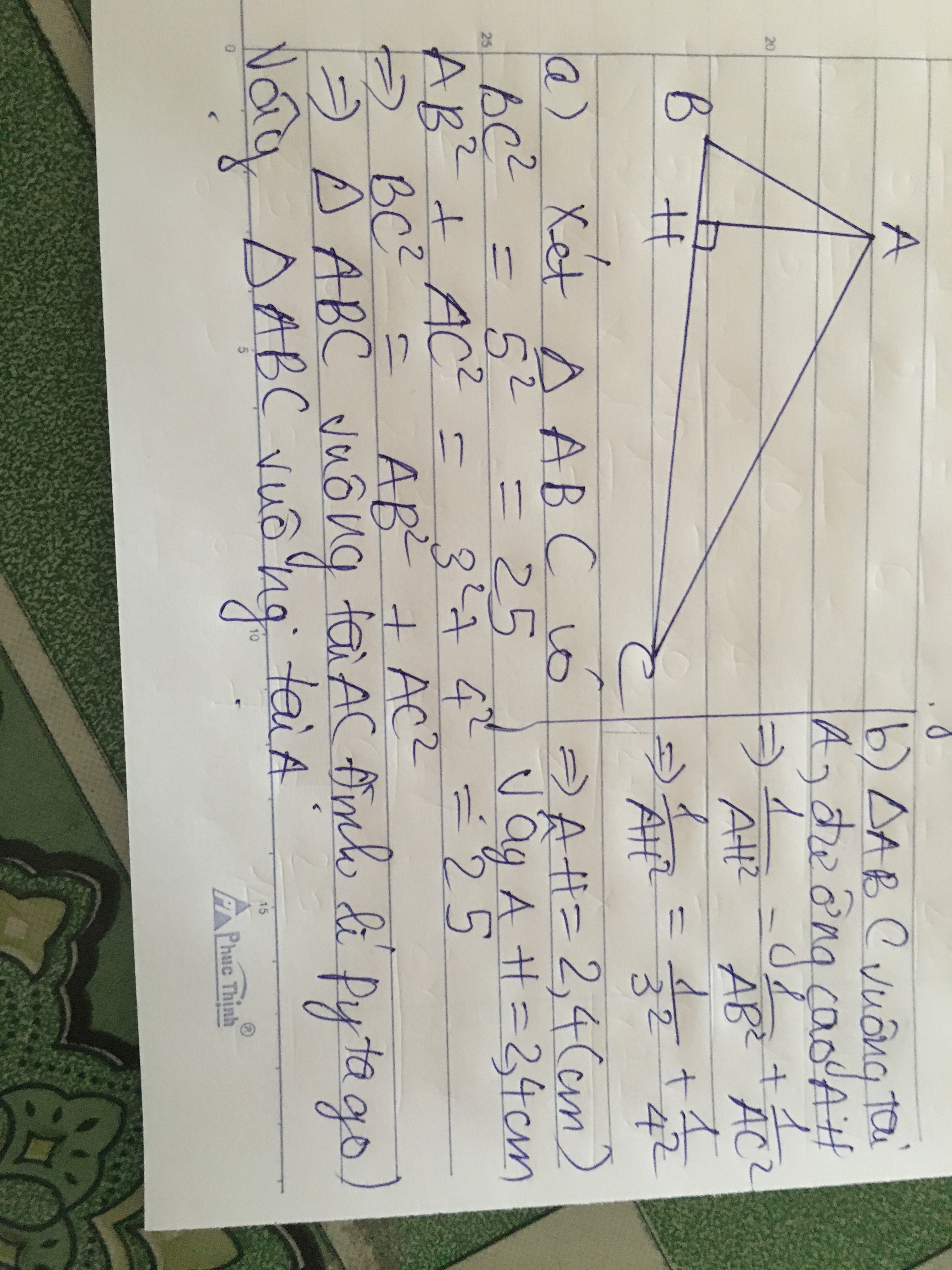 cho tam giác ABC có AB =3cm , AC=4cm , BC=5cm , AH là đường cao của tam giác ABC a. CMR : tam giác ABC vuông b. Tính AH