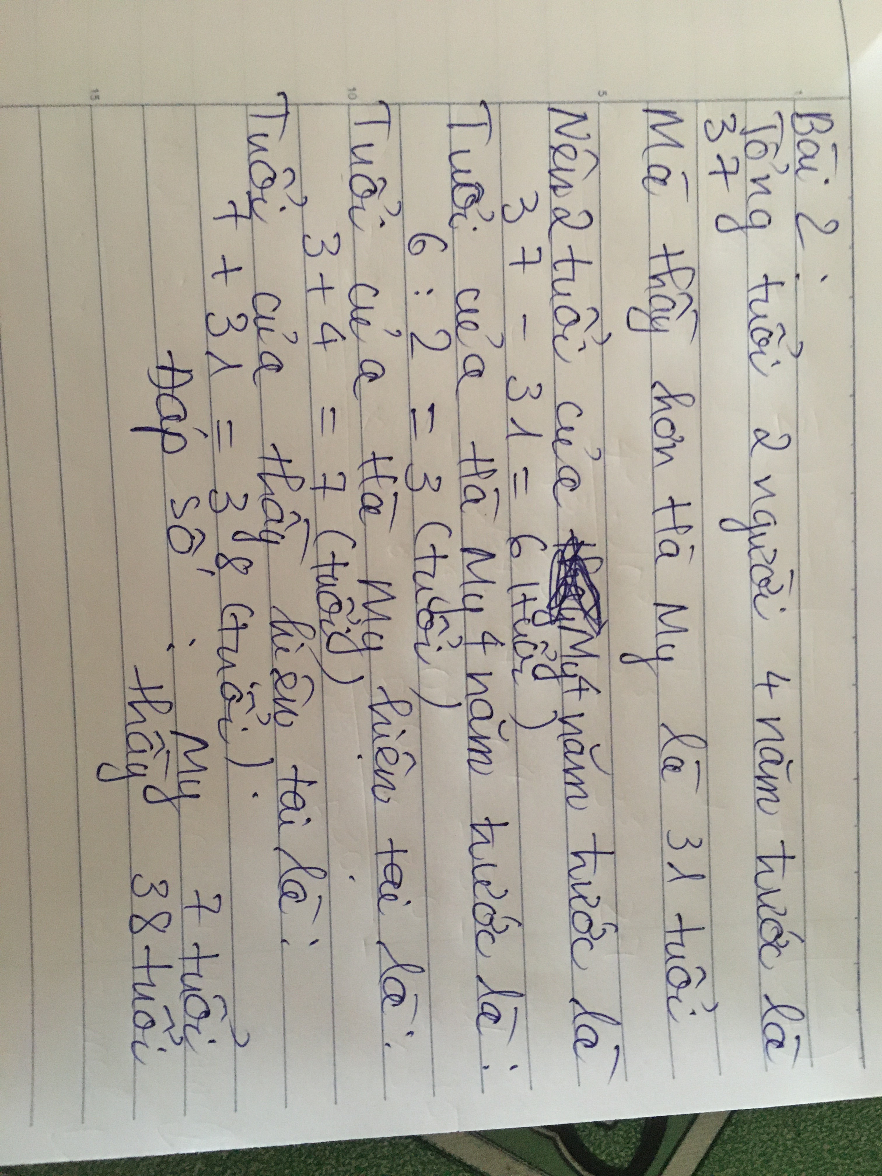 Đáp số: Hà My; 7 tuổi, Thầy: 38 tuổi