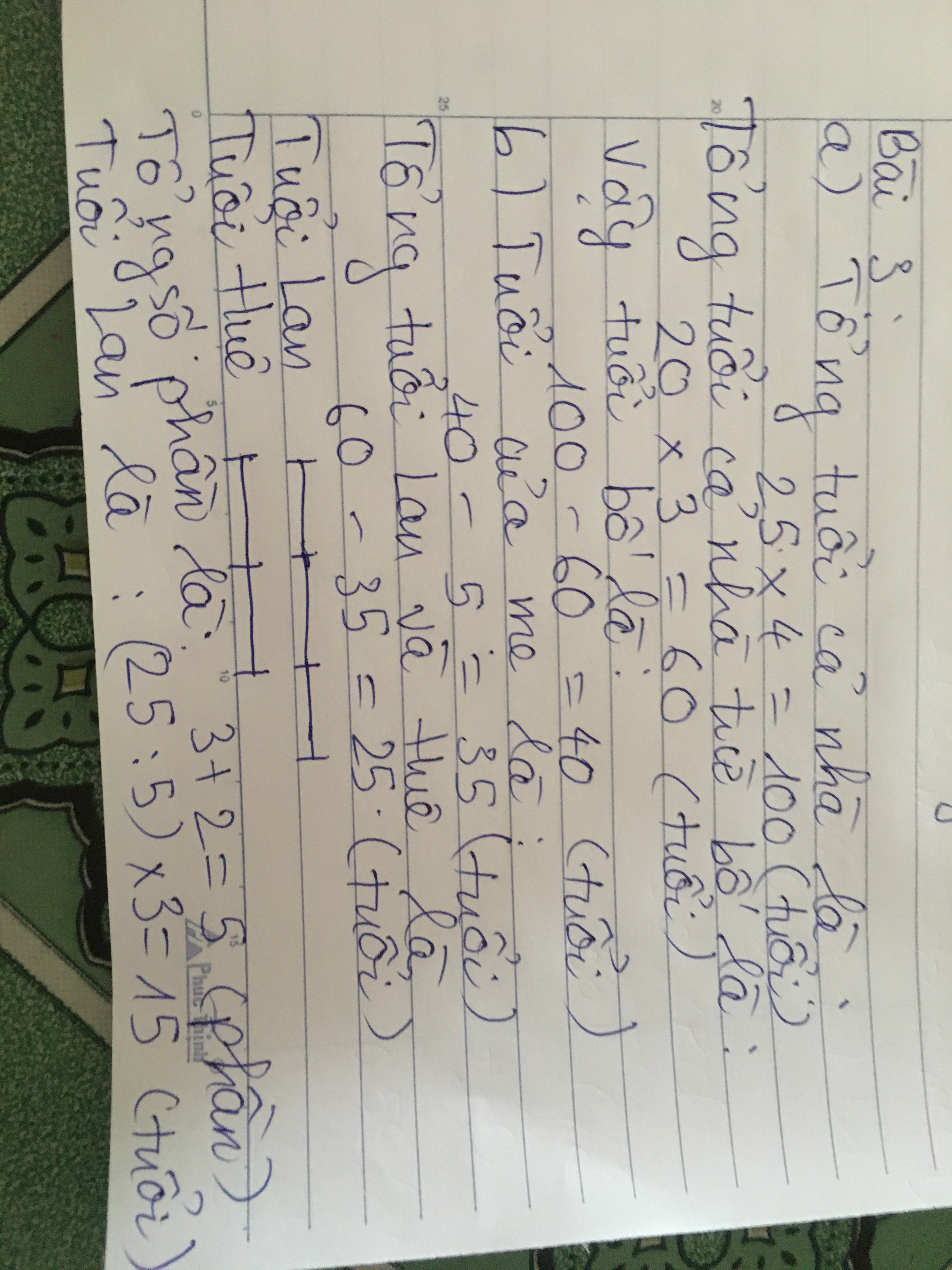 Bài 3: Trung bình cộng tuổi bố, mẹ ; Lan và em Huệ là 25 tuổi, Không tỉnhbổ thì tuổi trung bình của cả nhà là 20 .