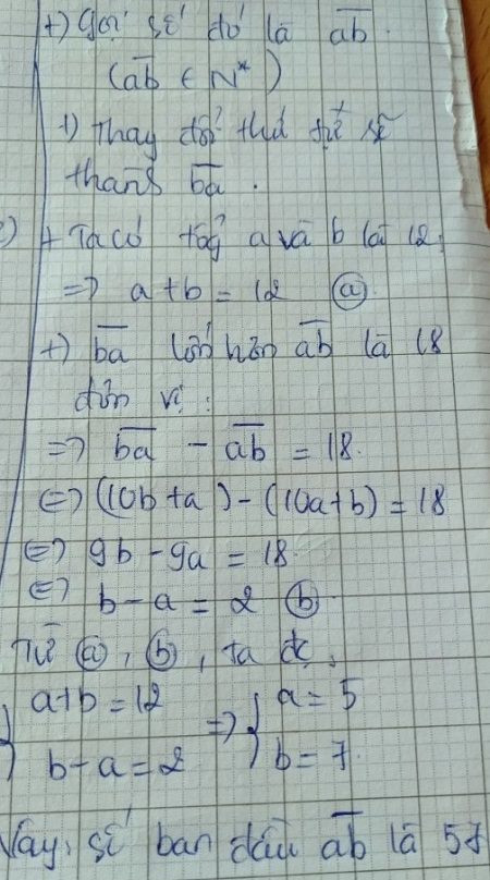 tìm một số có 2 chữ số biết rằng tổng 2 chữ số là 12 và khi thay đổi thứ tự 2 chữ số thì được một số lớn hơn số cũ 18