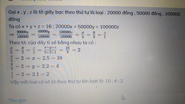 Gọi số tờ giấy bạc của mỗi tờ lần lượt là x, y, z.