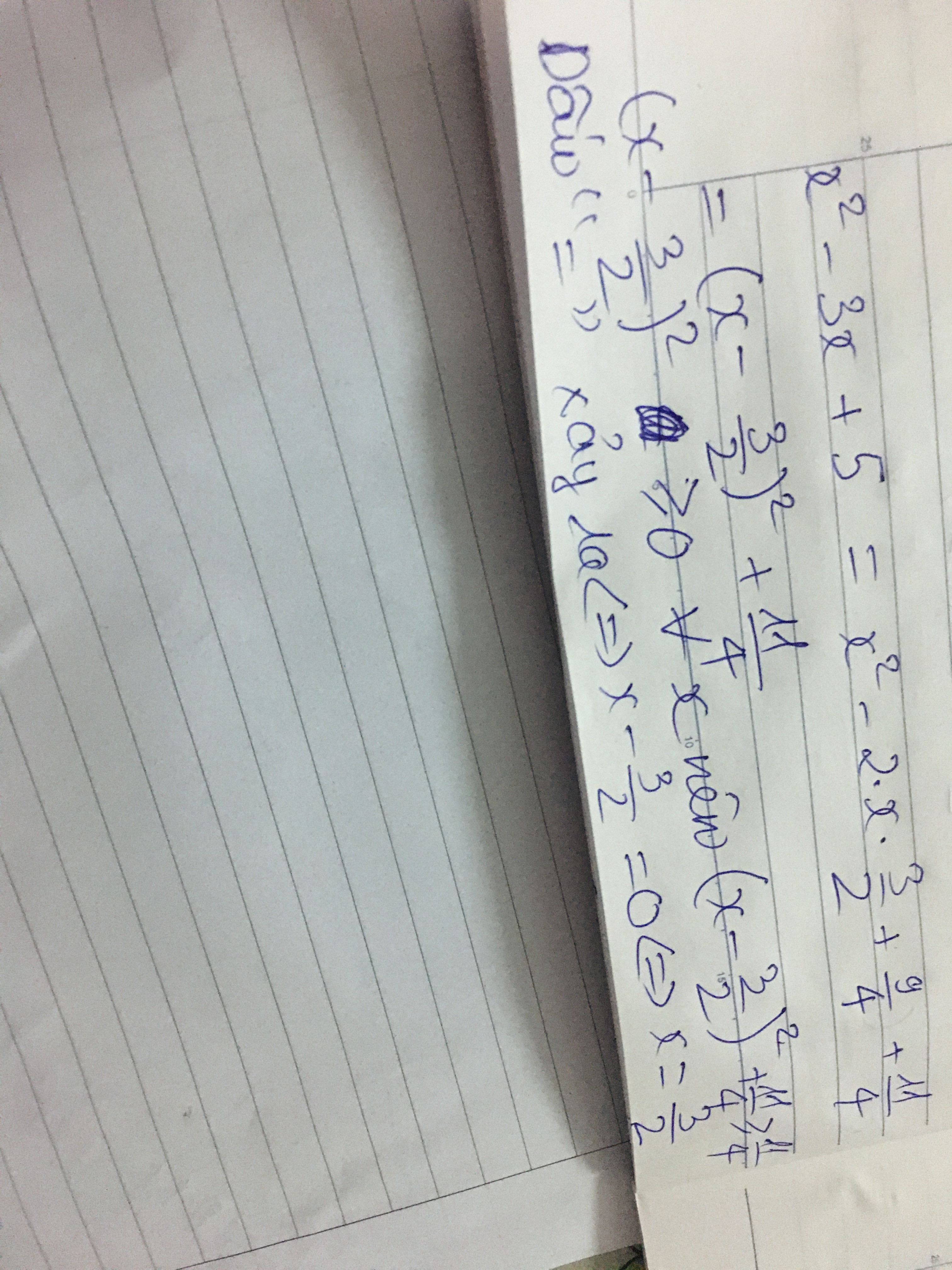 Ta có:(x-32)2≥0 ∀x∈ℝ⇒(x-32)2+114≥114 ∀x∈ℝ⇒x²-3x+5≥114 ∀x∈ℝdấu "=" xảy ra khi:x=32Vậy GTLN của biểu thức là 114 khi x=32.