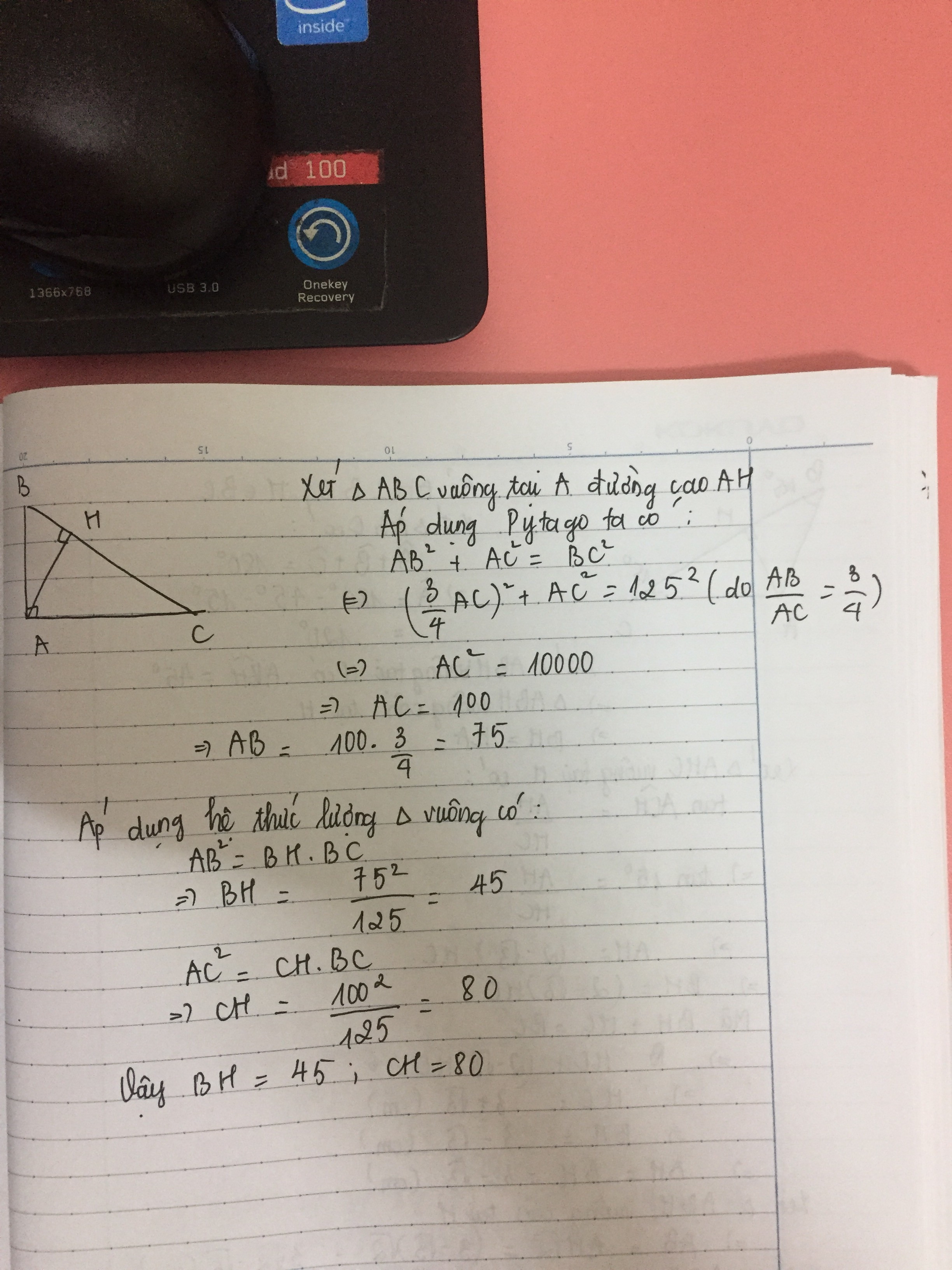 Cho tam giác ABC vuông tại A , đường cao AH , BC =125 ,AB/AC=3/4 .tính BH và HC