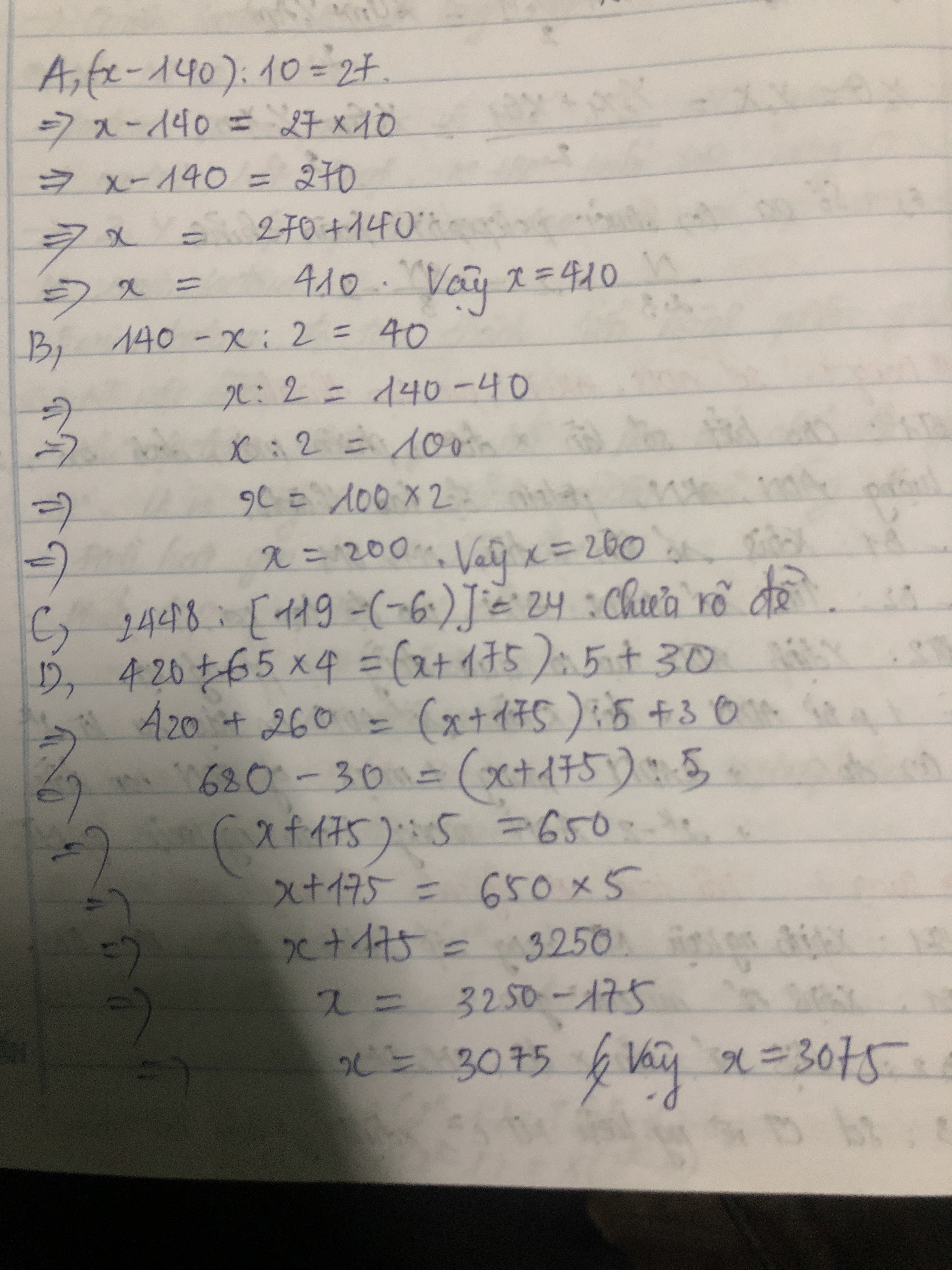 D.{\rm{ }}420 + 65{\rm{ }}.4 = \left( {x + 175} \right):5 + 30\\