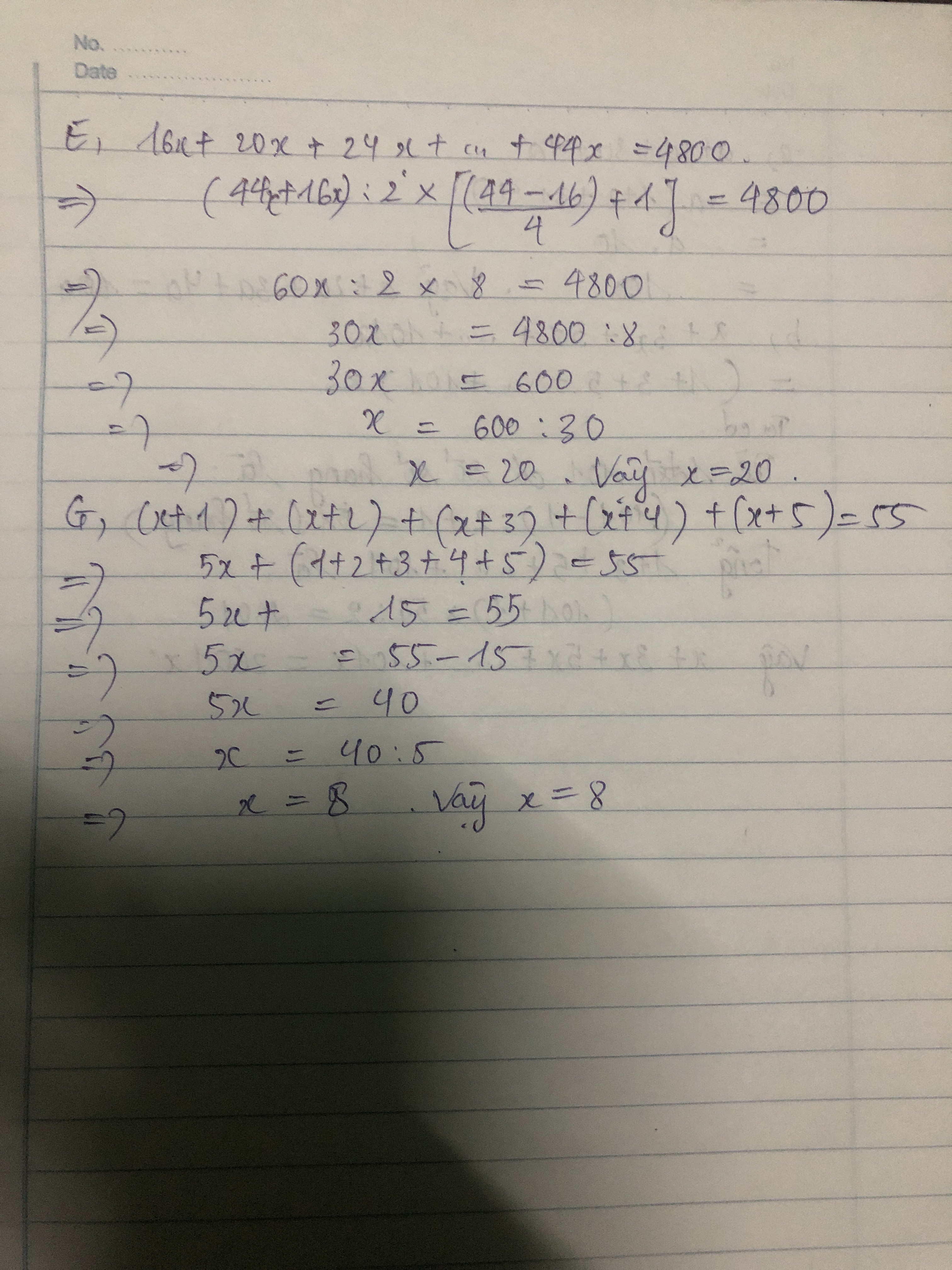 G.{\rm{ }}\left( {x + 1} \right) + \left( {x{\rm{ }} + 2} \right){\rm{ }} + \left( {x{\rm{ }} + 3} \right){\rm{ }} + \left( {x{\rm{ }} + 4} \right){\rm{ }} + \left( {x{\rm{ }} + 5} \right) = 55\\