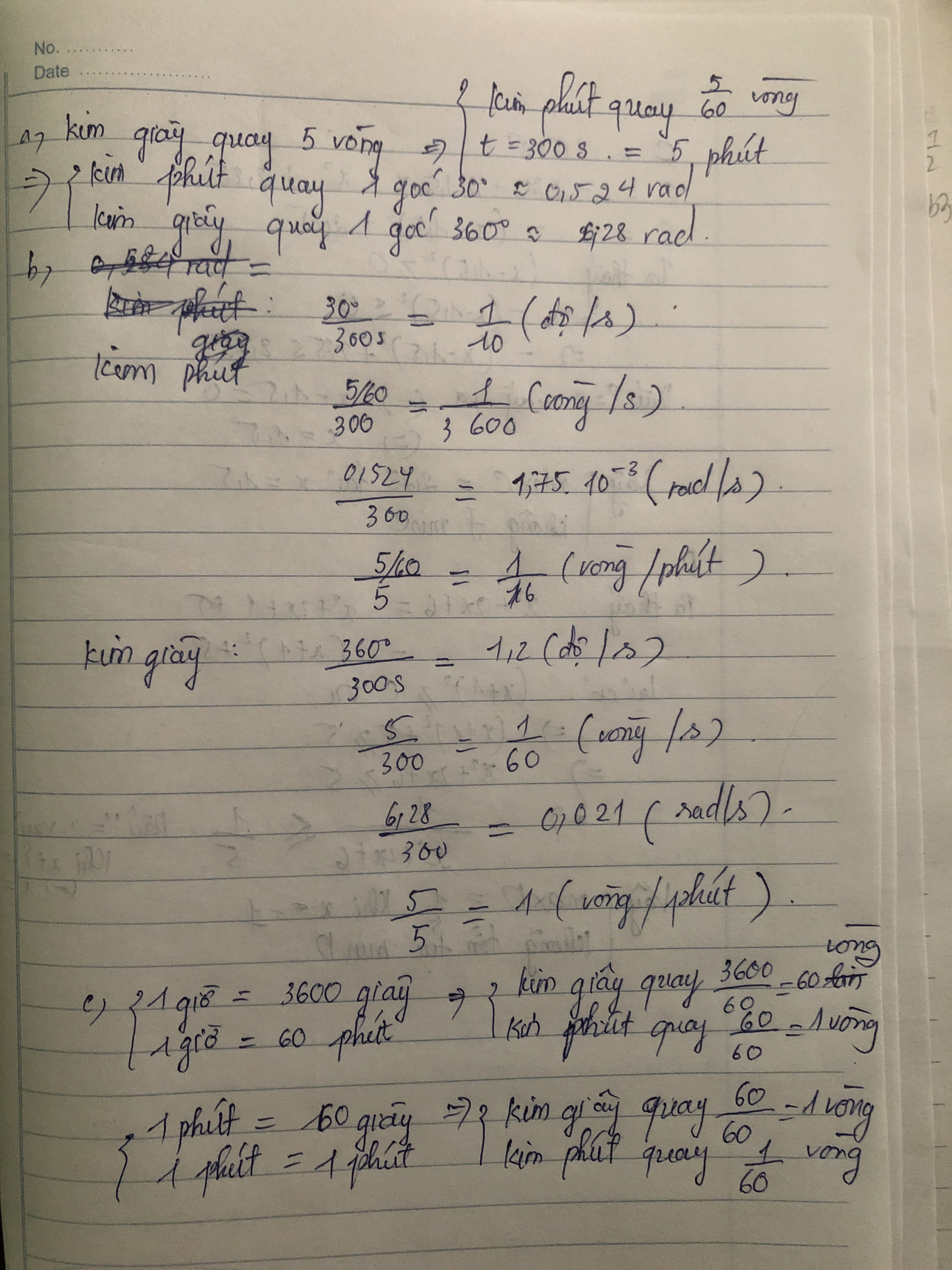 a) Tính góc quay của kim giây và kim phút ra độ và rad