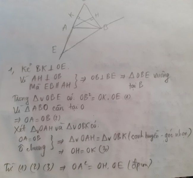 cho tam giác AOB cân tại O. đường thẳng B song song với đường cao AH của tam giác AOB cắt tia OA tại E.