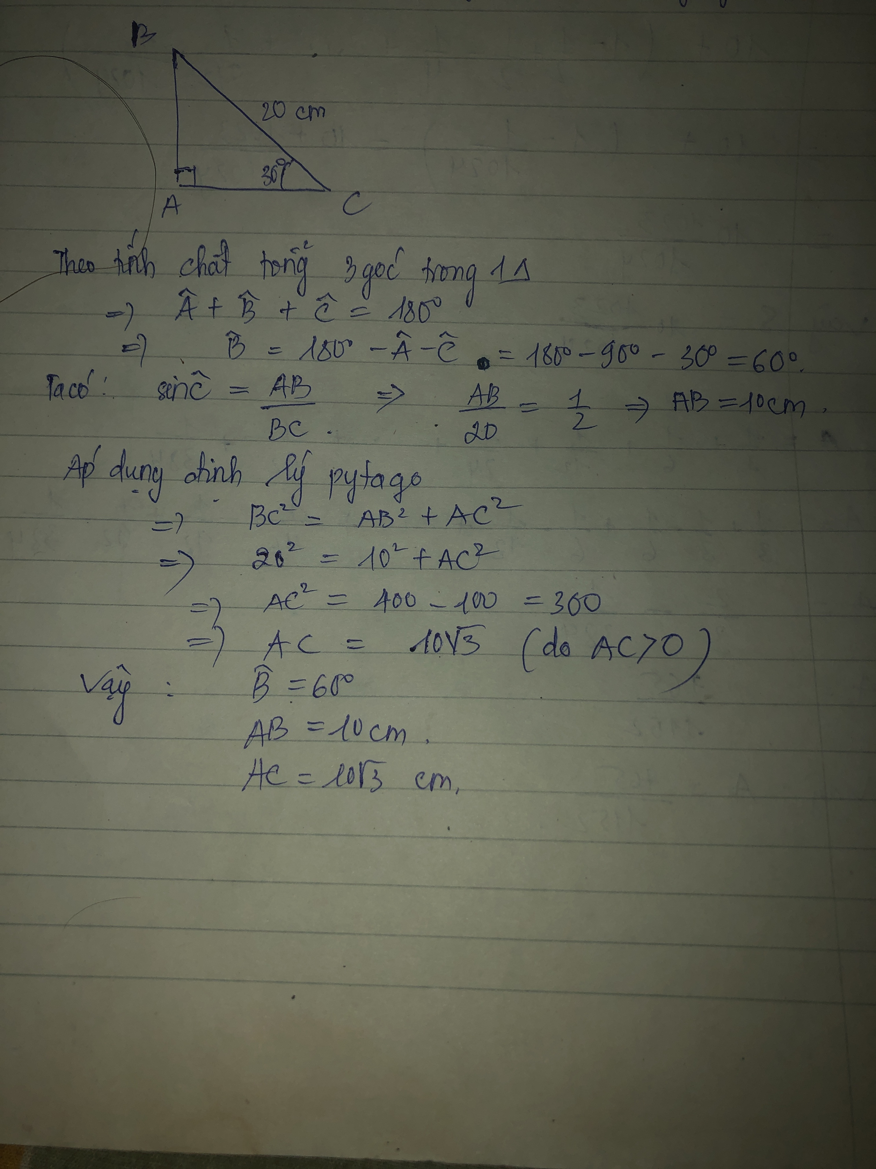 Cho tam giác ABC (Â=90°), biết BC = 20cm , C= 30° . Tính B , AC ,AB .