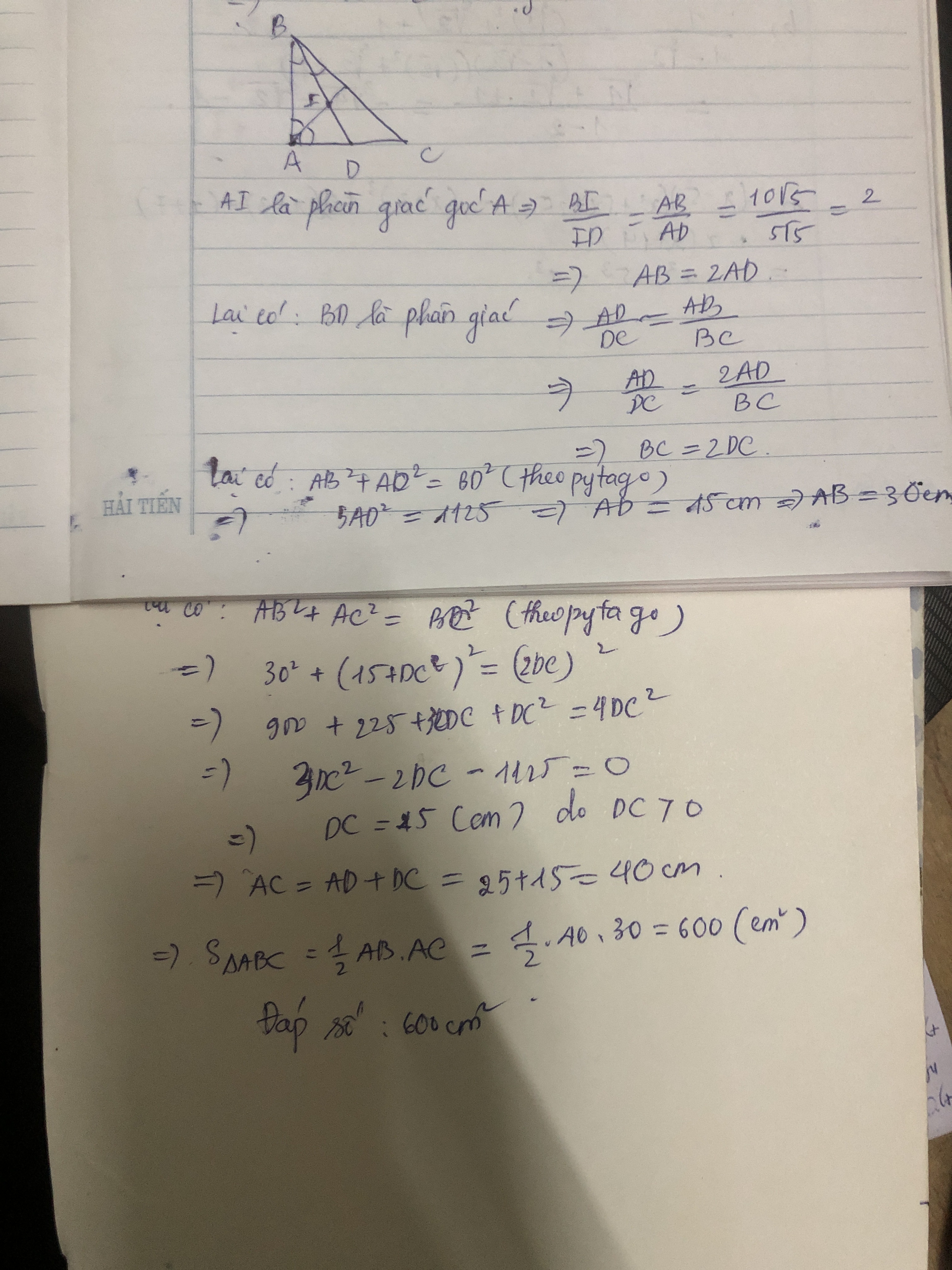 Tam giác ABC vuông tại A, đường phân giác BD. Tia phân giác của góc A cắt BD ở I. Biết IB=10 căn 5, ID=5 căn 5, tính diện tích tam giác ABC