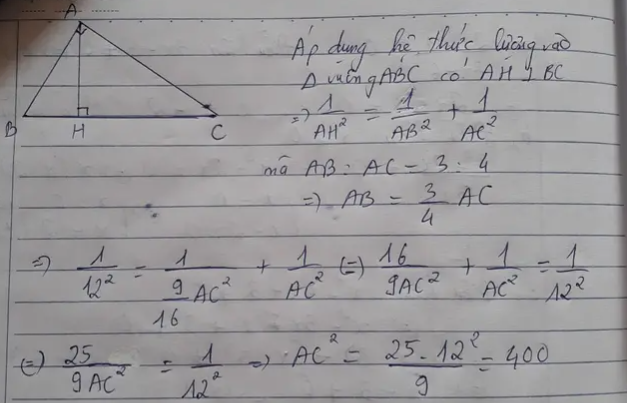 = > \frac{1}{{{{12}^2}}} = \frac{1}{{{{(\frac{3}{4}AC)}^2}}} + \frac{1}{{A{C^2}}}(do:\frac{{AB}}{{AC}} = \frac{3}{4})\\