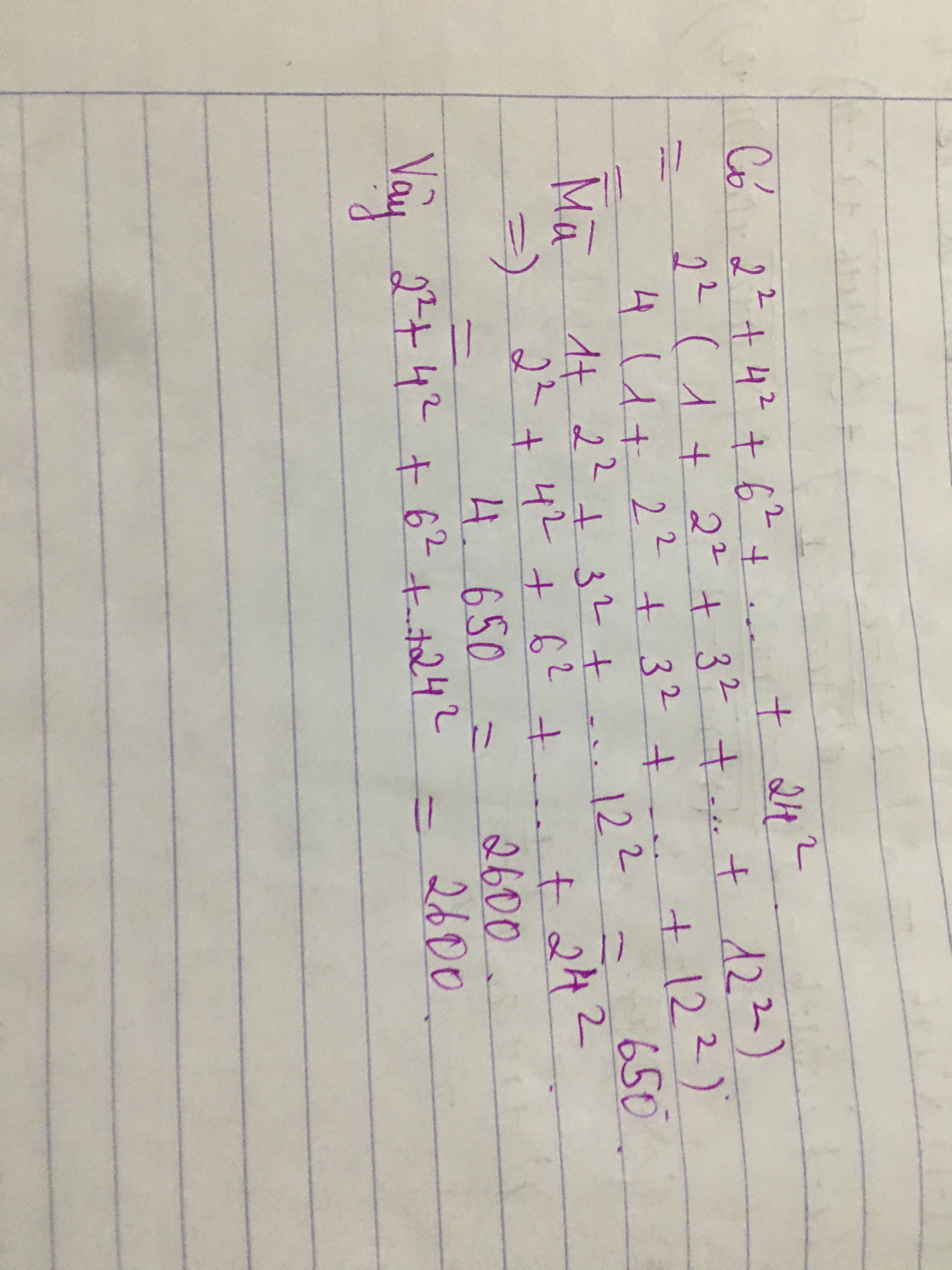 Cho Biết 1 mũ 2 + 2 mũ 2 + 3 mũ 2 +...+ 12 mũ 2 = 650 . Tính 2 mũ 2 + 4 mũ 2 + 6 mũ 2 + ... + 24 mũ 2 bằng bao nhiêu