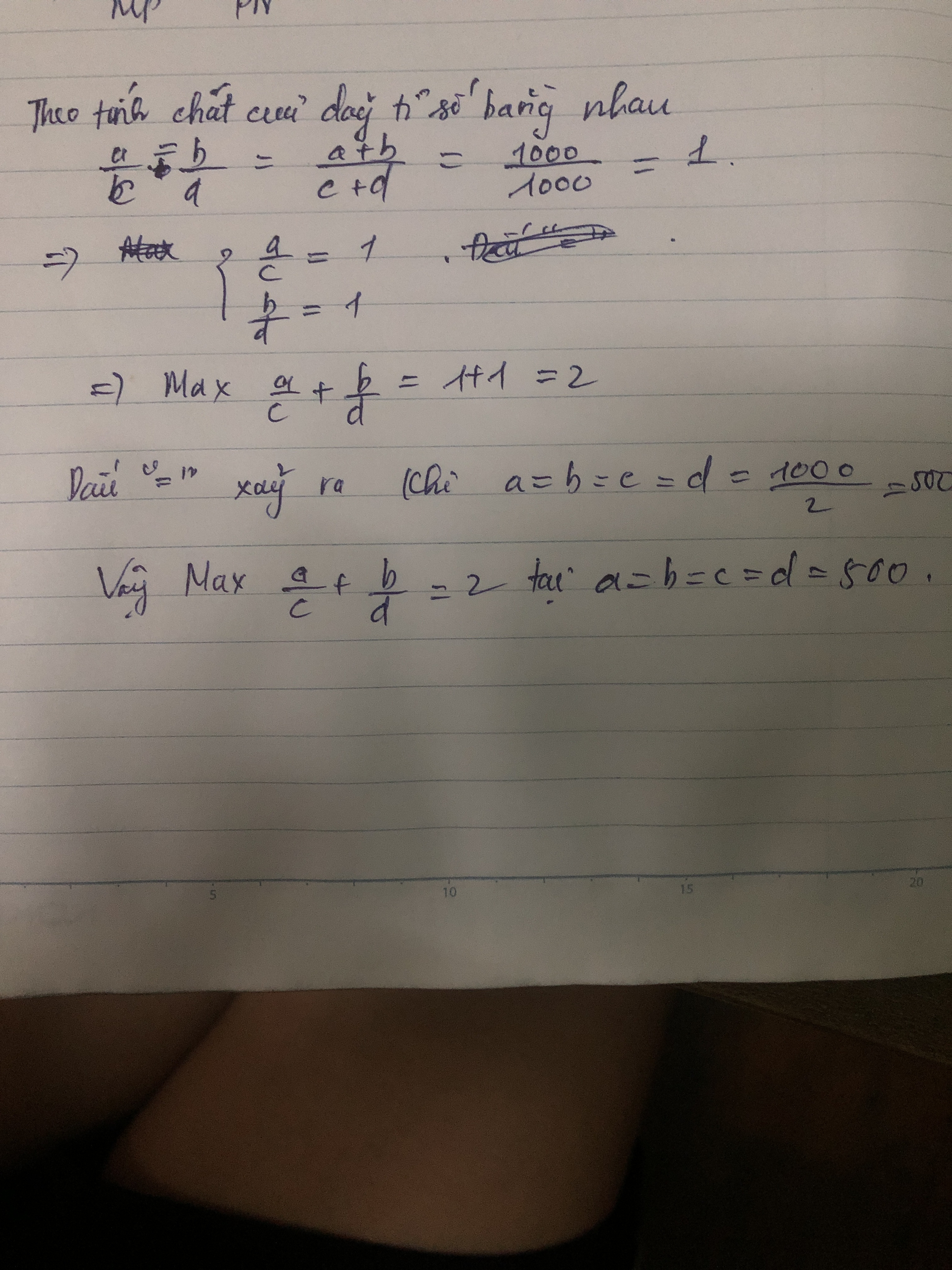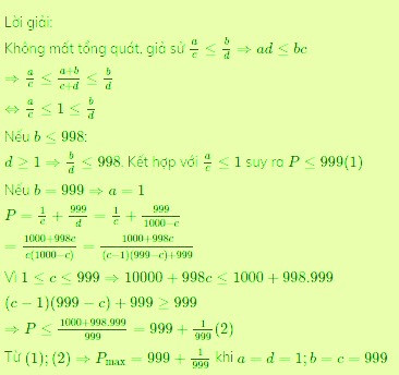 cho các số nguyên dương a,b,c,d thoả mãn a+b=c+d=1000 hỏi khi nào tổng a/c+b/d đạt giá trị lớn nhất