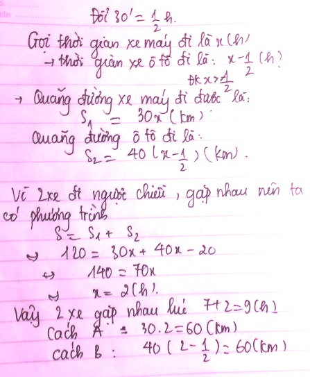 Hai điểm A và B cách nhau 120km. Lúc 7h xe máy xuất phát từ A đi đến B với vận tốc 30km/h. Nửa tiếng sau xe ô tô xuất phát từ B đi về A với vận tốc v2 = 40km/h. Hỏi 2 xe gặp nhau lúc mấy giờ và ở đâu ?