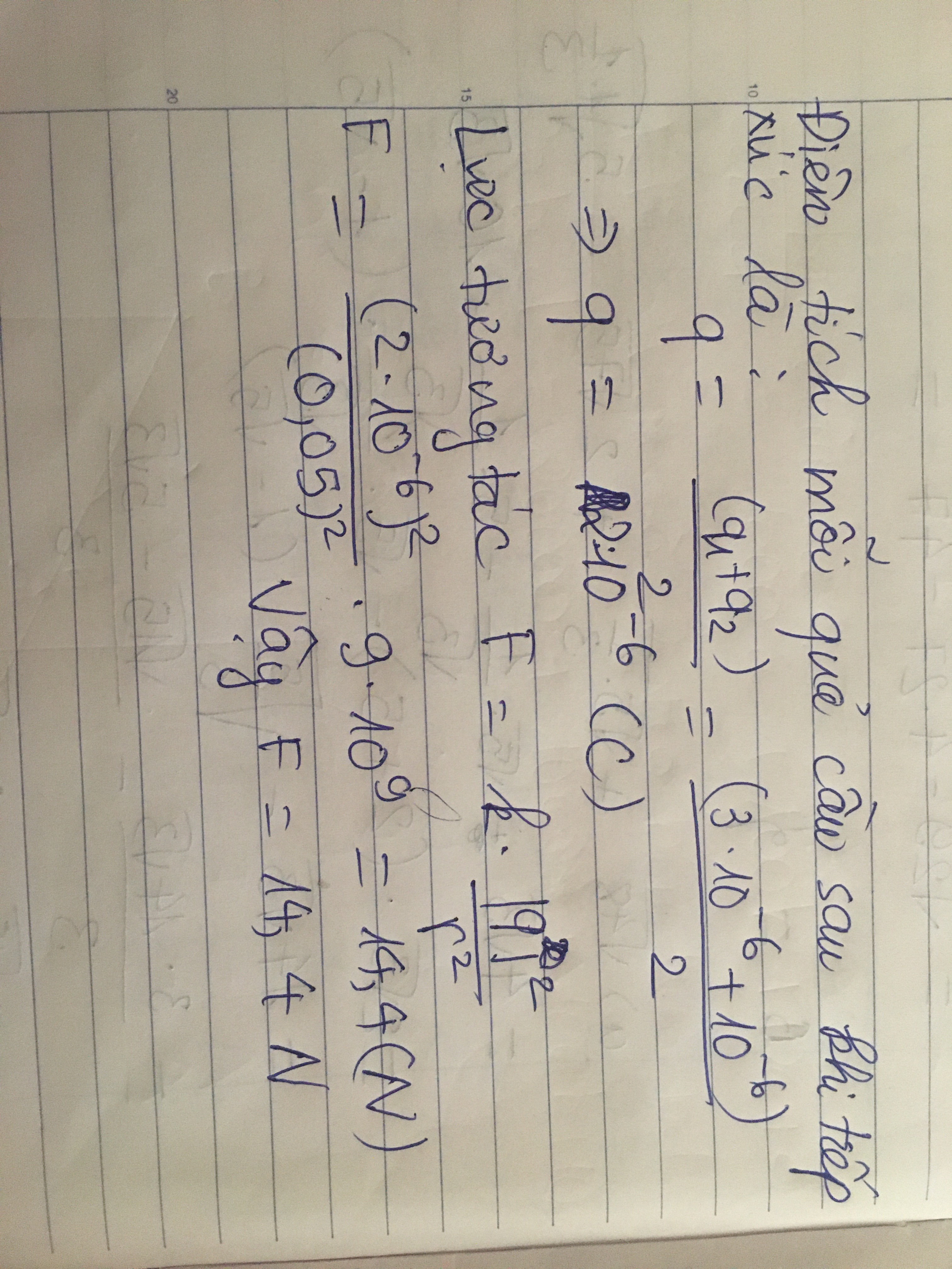 Hai quả cầu kim loại nhỏ giống nhau mang điện tích lúc đầu là q1 = 3.10-6 C và q2 =10-6 C. Cho chúng tiếp xúc nhau rồi đặt cách nhau 5 cm trong không khí. Lực tương tác giữa chúng là