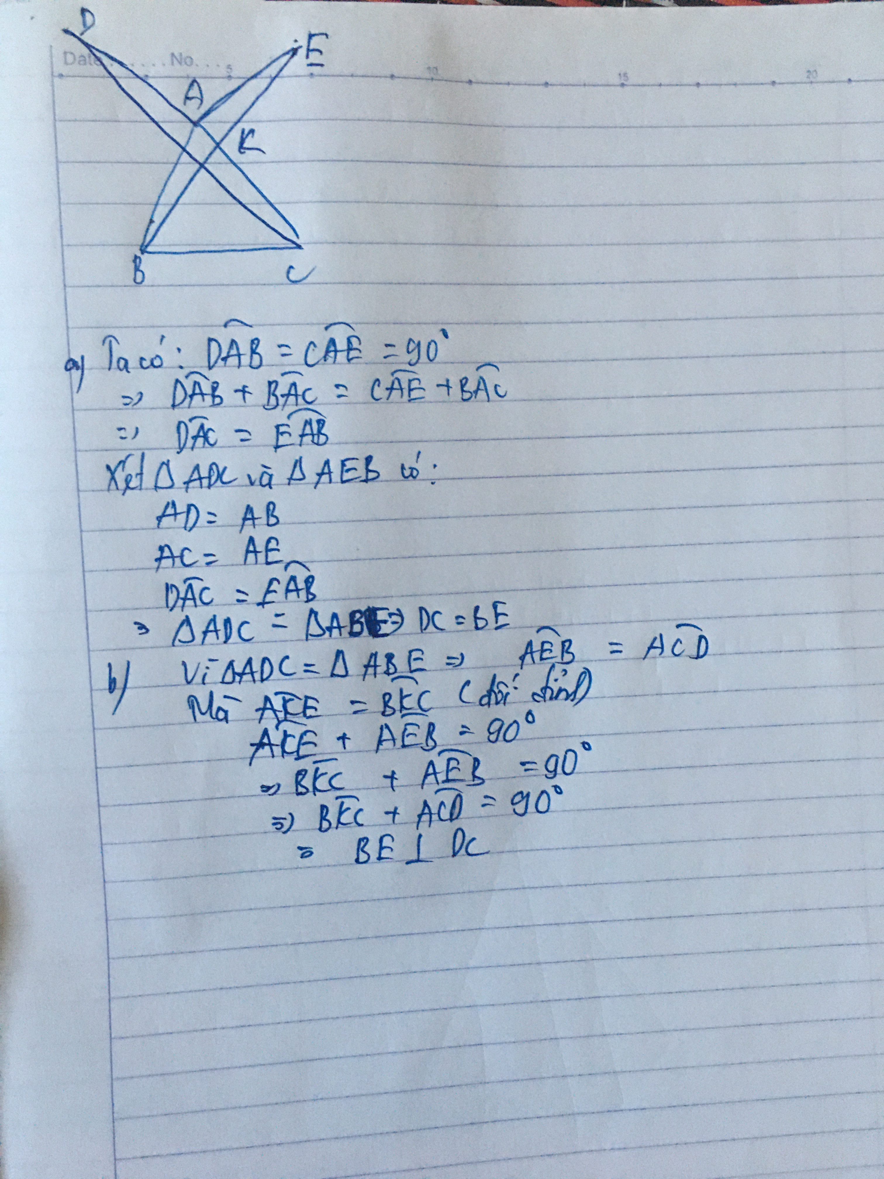 Cho tam giác ABC. Dựng về điểm D nằm khác phía với điểm C đối với AB sao cho AD vuông góc AB, AD = AB; dựng điểm E nằm khác phía với điểm B đối với AC sao cho AE vuông góc AC, AE = AC. Chứng minh rằng: