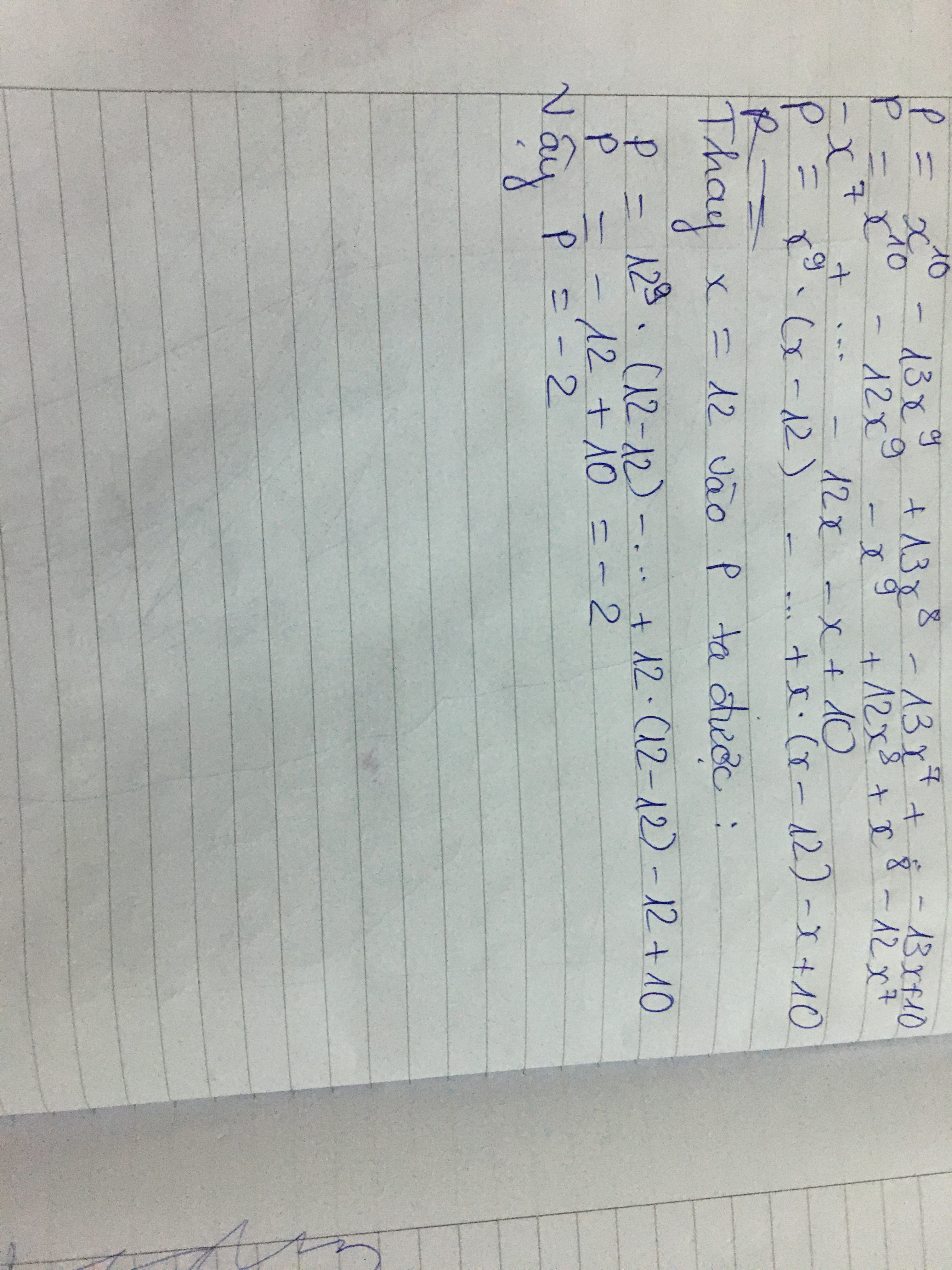 P= x^10 - 13x^9 + 13x^8 - 13x^7 +..... -13x + 10 tại x = 12