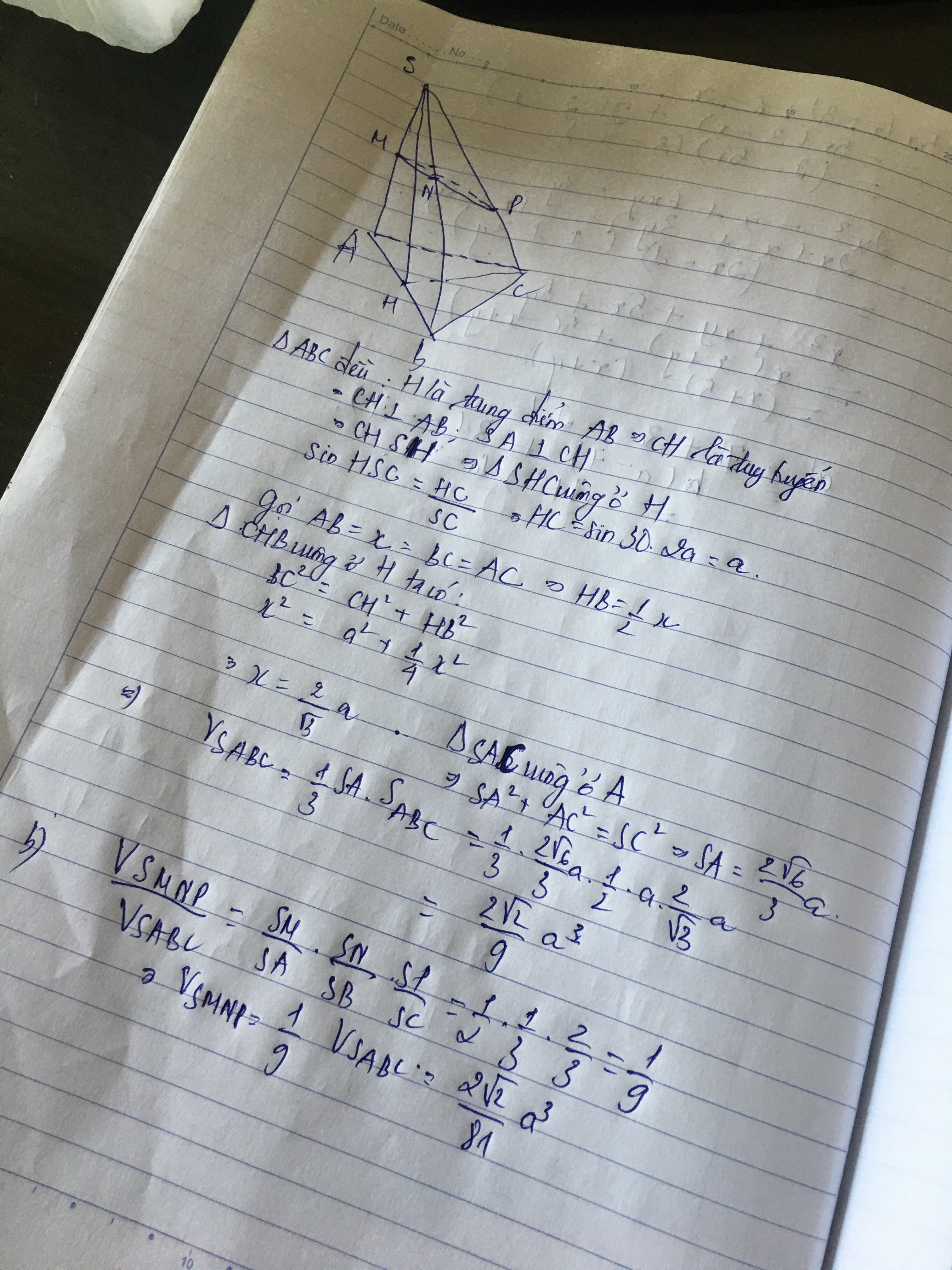 Cho hc sabc có đáy là tg đều , sa vuông đáy , sc bằng 2a, gọi H là trung điểm ab góc HSC =30 . câu a tính thể tích sabc, câu b : gọi m là tđ sa, n thuộc sb sao cho sb=2sn, p là điểm thuộc sc sao cho sp=2pc , tính thể tích smnp