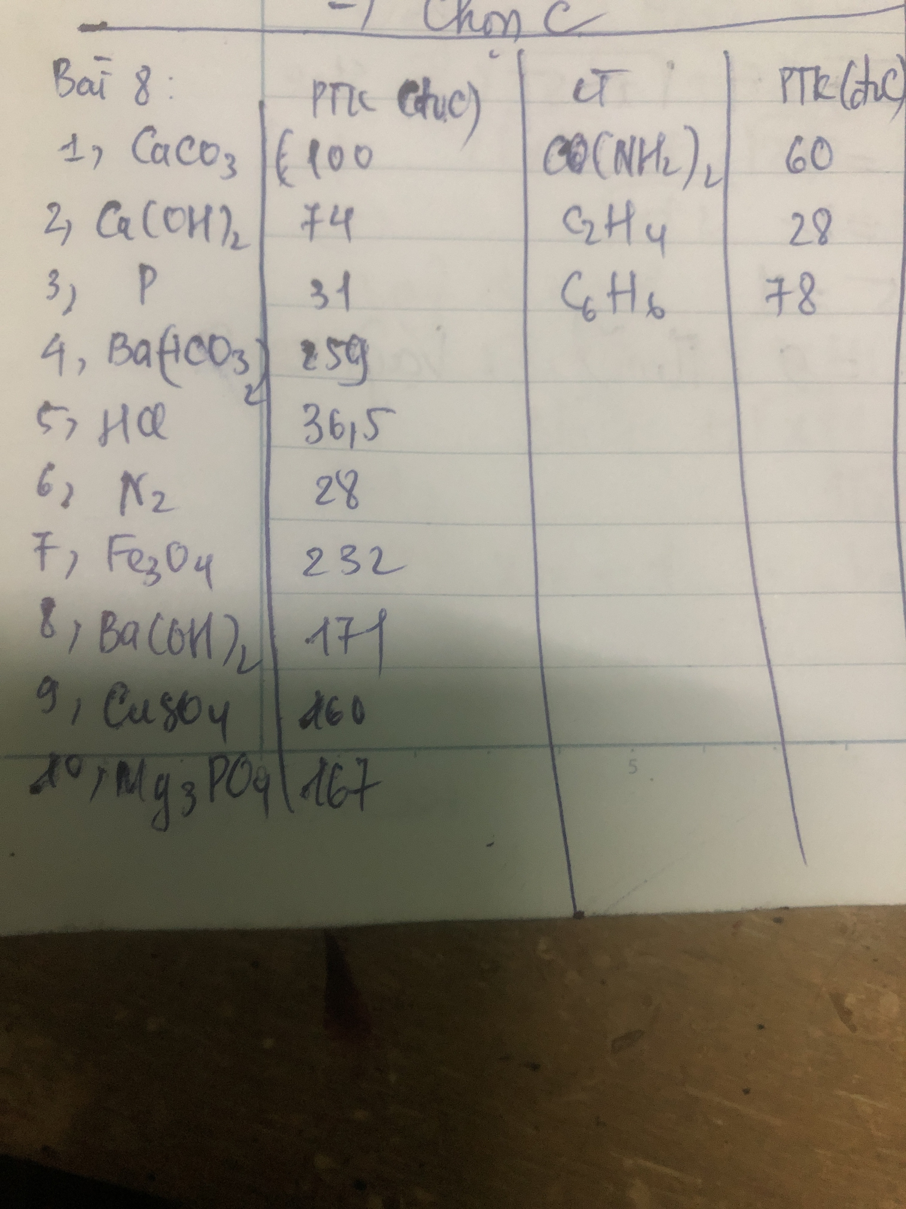 Bài 8. Viết công thức hóa học và tính PTK của các chất sau: